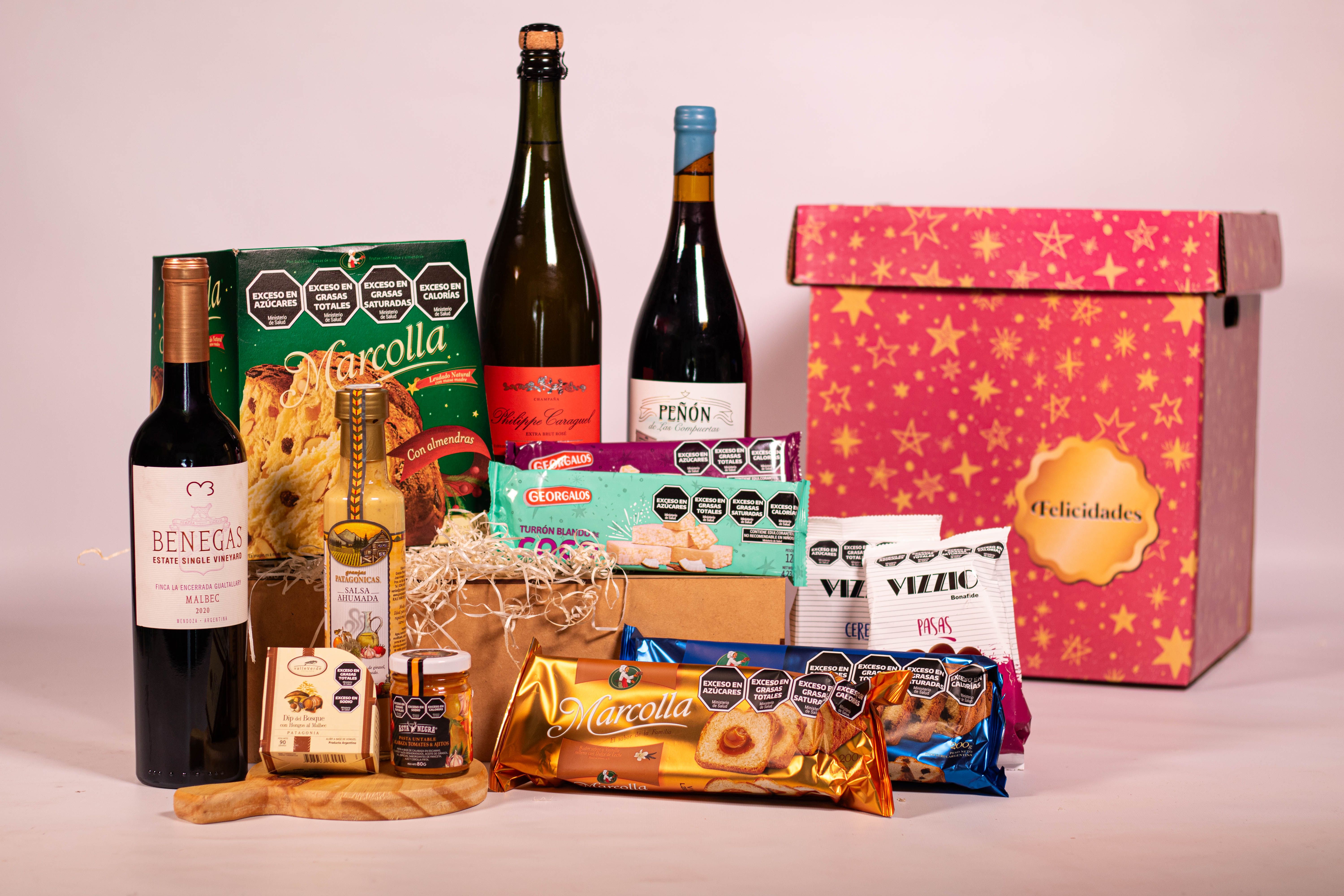 El Baúl Santa Claus contiene 14 productos detallados a continuación: 1) ESPUMANTE EXTRA BRUT ROSE PHILIPPE CARAGUEL x 750cc 2) BENEGAS SINGLE VINEYARD MALBEC x 750cc 3) PEÑON DE AGRELO CORTE DE FINCA x 750cc - LAMADRID 4) PAN DULCE MARCOLLA CON ALMENDRAS x 600g (Estuche) 5) BUDIN MARCOLLA RELLENO CON DULCE DE LECHE x 200g 6) BUDIN MARCOLLA CON CHIPS DE CHOCOLATE x 200g 7) VIZZIO PASAS DE UVA x 80g (Bonafide) 8) VIZZIO CEREAL x 80g (Bonafide) 9) TURRON BLANDO DE COCO GEORGALOS x 120g 10) TURRÓN DE MANI Y ALMENDRAS GEORGALOS x 80g 11) PATE DE CALABAZA ,TOMATES Y AJO AHUMADO ASTA NEGRA 12) DIP DEL BOSQUE, HONGOS AL MALBEC x 90g - VALLE VERDE 13) SALSA GRANJAS PATAGÓNICAS x 250g (Hongos, Brava, Ahumada) 14) TABLITA DE MADERA PARA PICADA 20x15cm + CAJA BAULERA CON TAPA