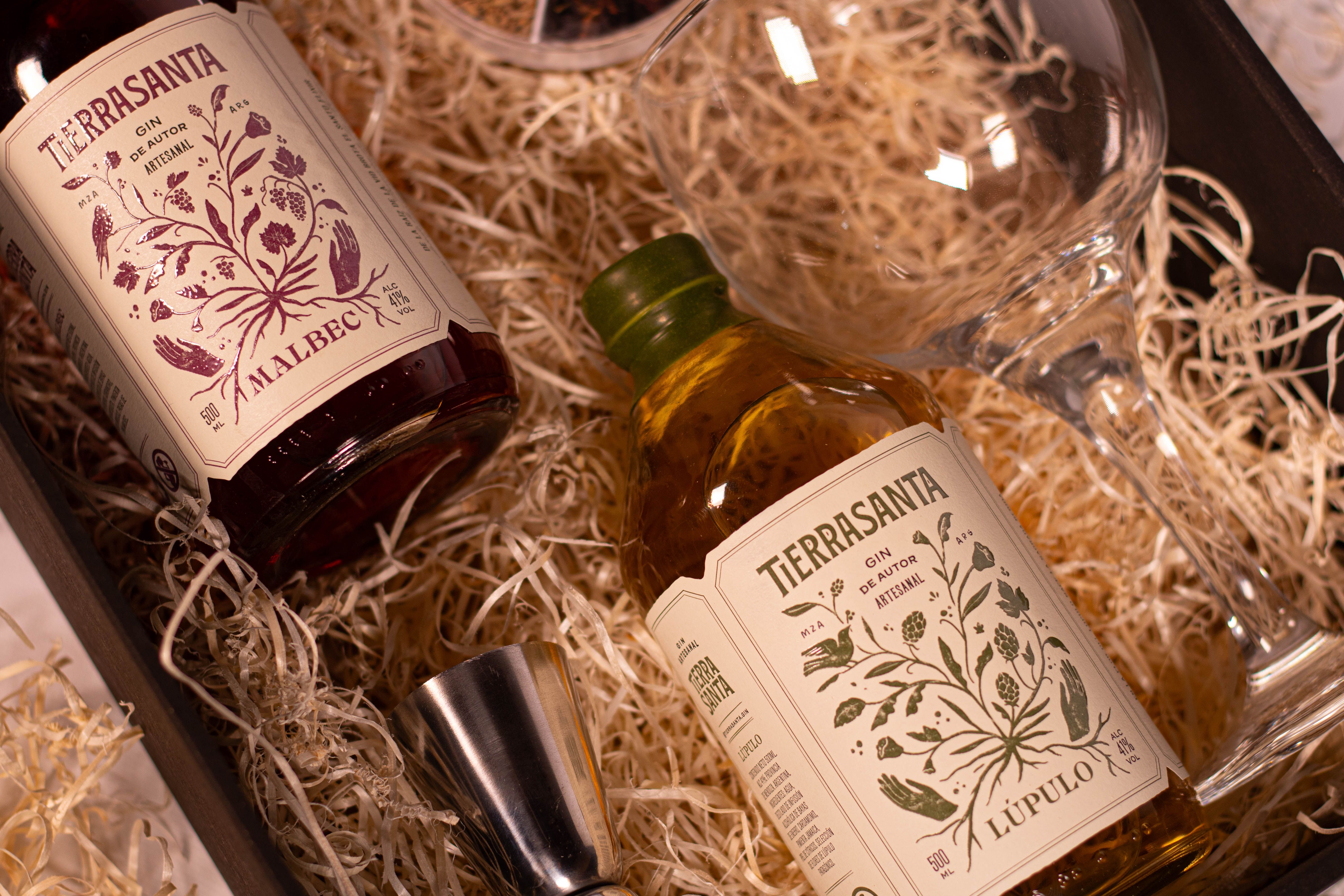 El Box Gin Tonic contiene 5 productos detallados a continuación: 1) GIN DE AUTOR TIERRA SANTA LUPULO x 500cc 2) GIN DE AUTOR TIERRA SANTA MALBEC x 500cc 3) COPA DE VIDRIO GIN TONIC 4) MEDIDOR DE ONZAS JIGGER 5) SET DE BOTÁNICOS PARA GIN + CAJA MICROCORRUGADA NEGRA DECORADA