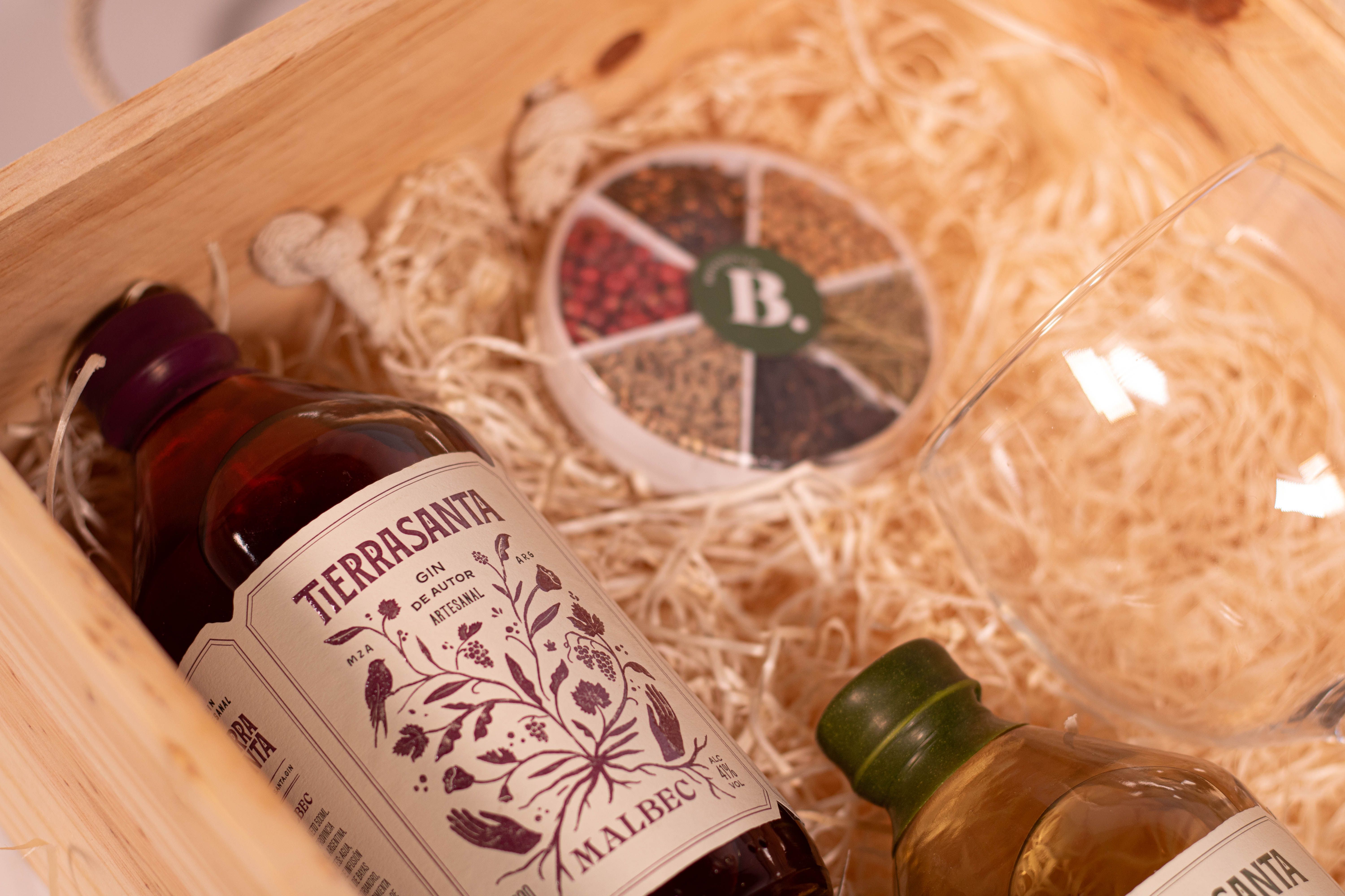 El Box Gin Tonic contiene 5 productos detallados a continuación: 1) GIN DE AUTOR TIERRA SANTA LUPULO x 500cc 2) GIN DE AUTOR TIERRA SANTA MALBEC x 500cc 3) COPA DE VIDRIO GIN TONIC 4) MEDIDOR DE ONZAS JIGGER 5) SET DE BOTÁNICOS PARA GIN + CAJA DE MADERA CON TAPA Este producto ofrece la posibilidad de personalizar la tapa de madera con el logotipo de su empresa. ¡Consultá costo adicional!