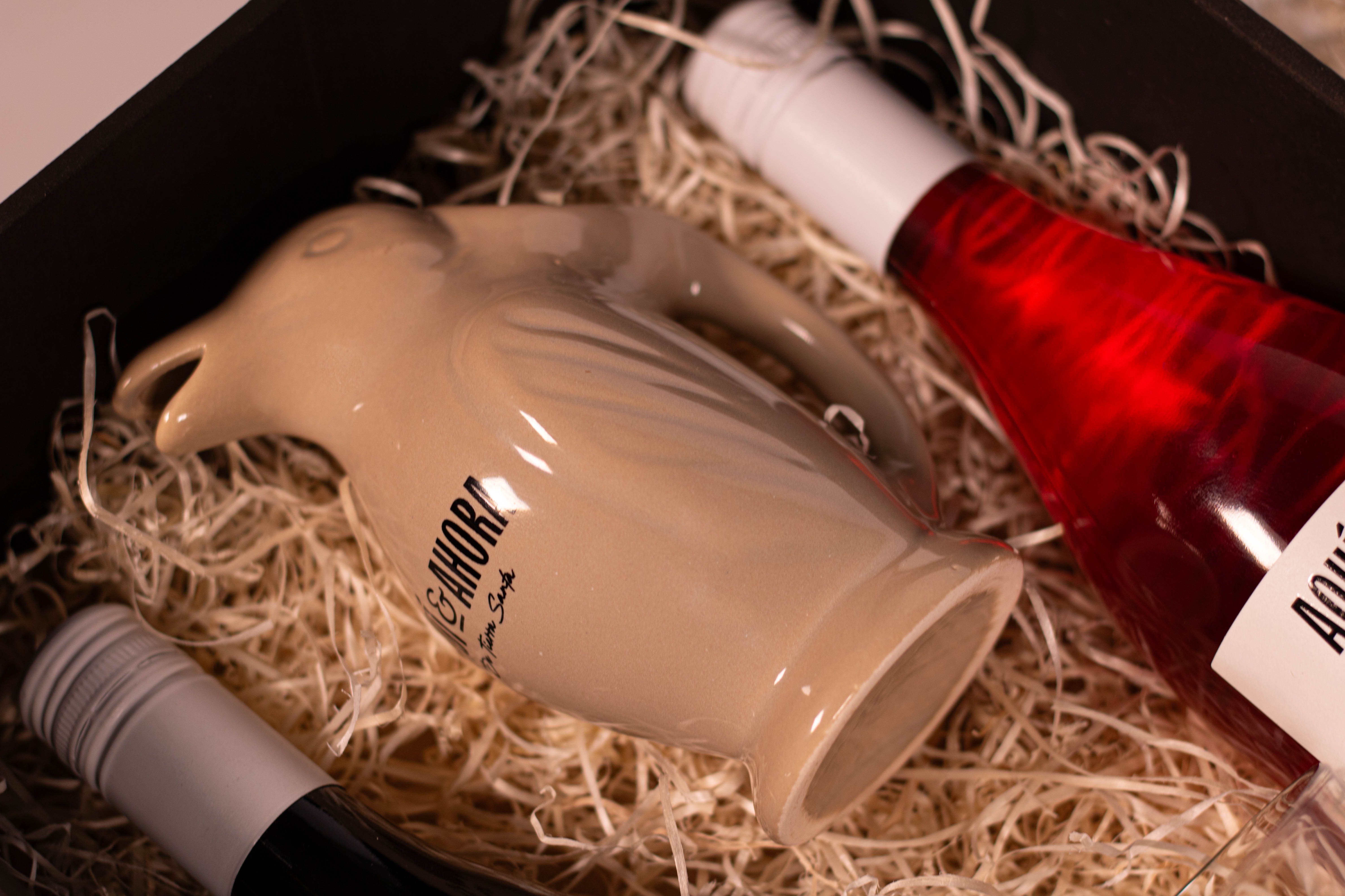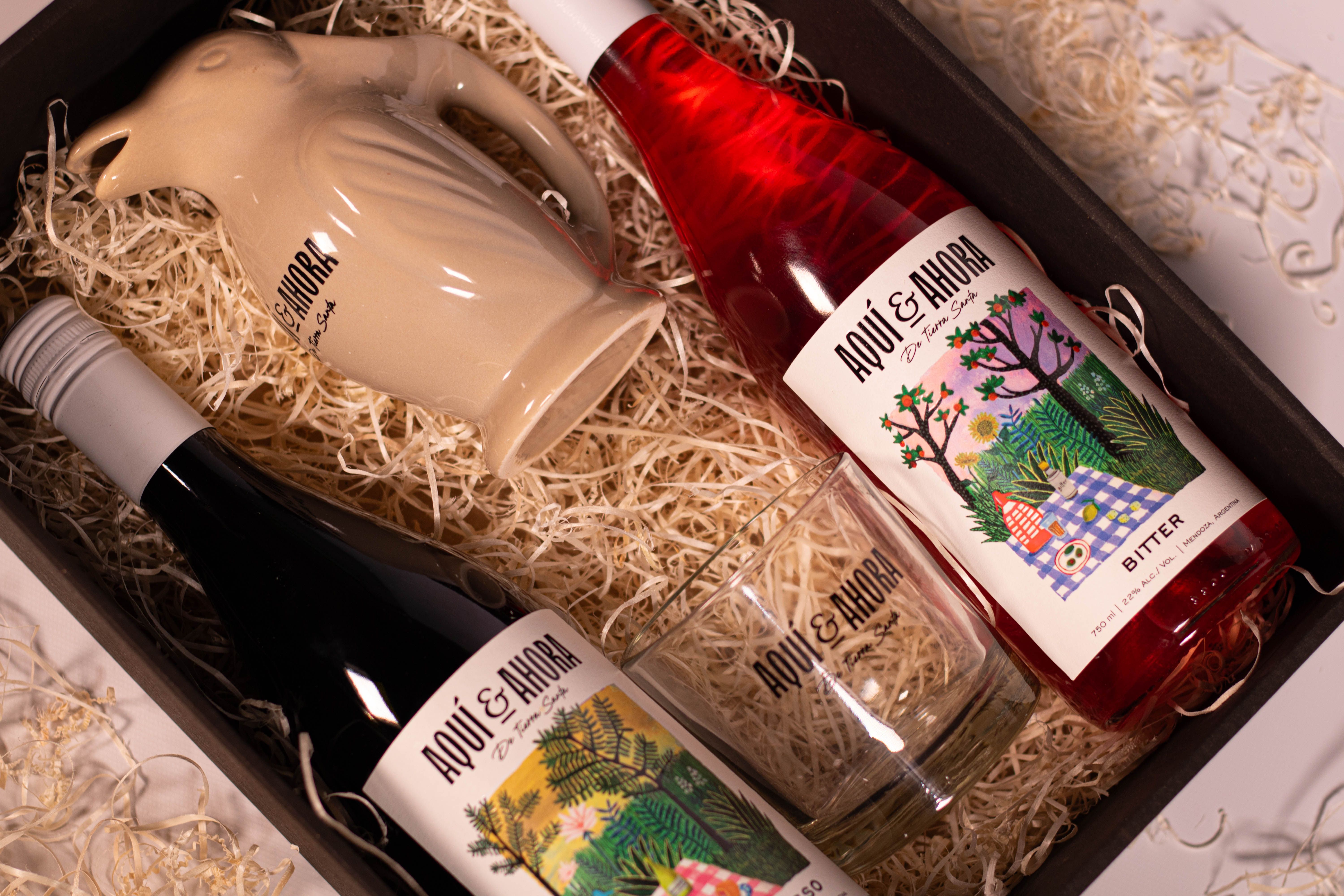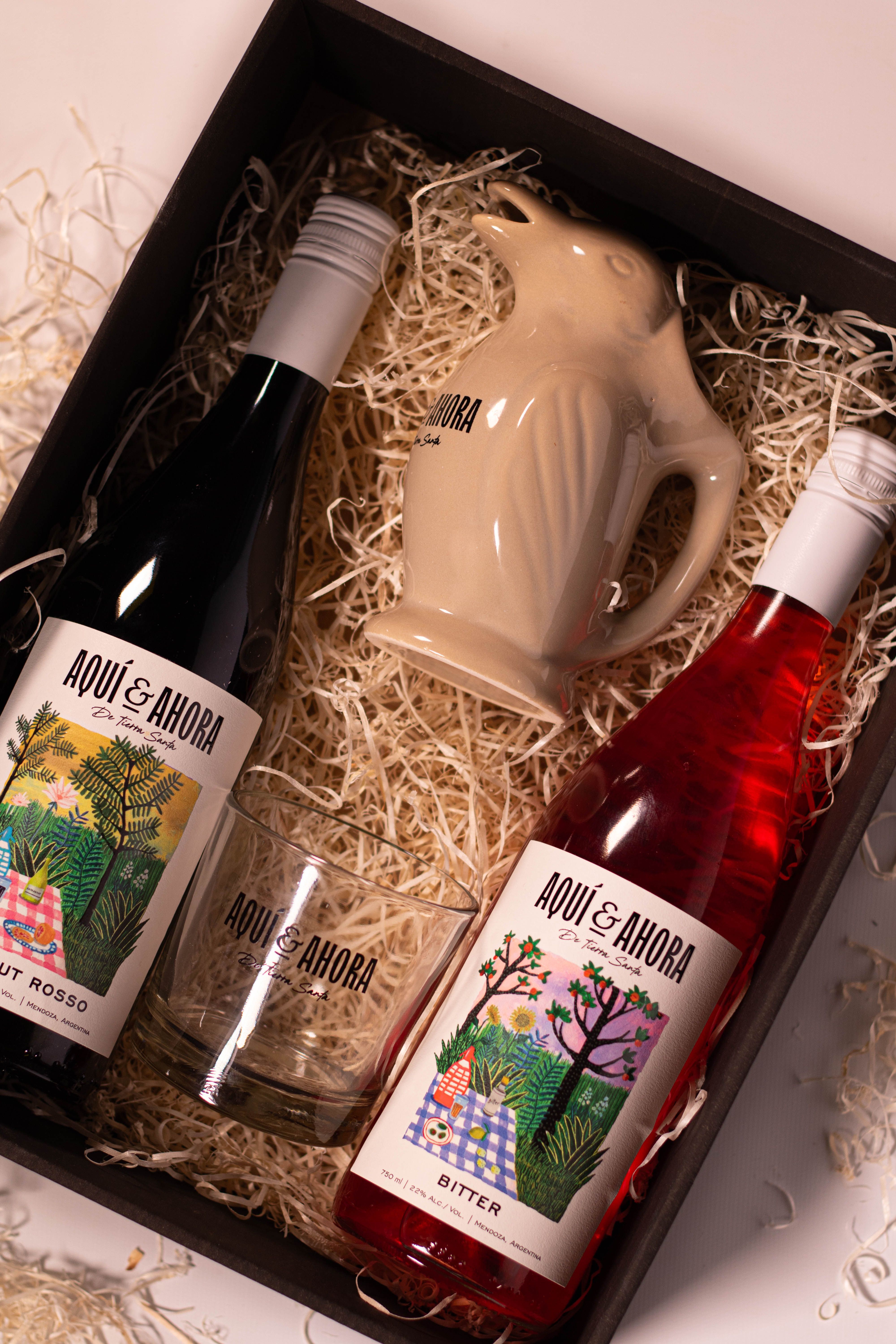 El Box Vermut contiene 4 productos detallados a continuación: 1) VERMUT ROSSO AQUI & AHORA x 750cc 2) BITTER AQUI & AHORA x 750 cc 3) VASO DE VIDRIO VERMUTERO 4) JARRA PINGUINO DE CERÁMICA x 350ml + CAJA MICROCORRUGADA NEGRA DECORADA