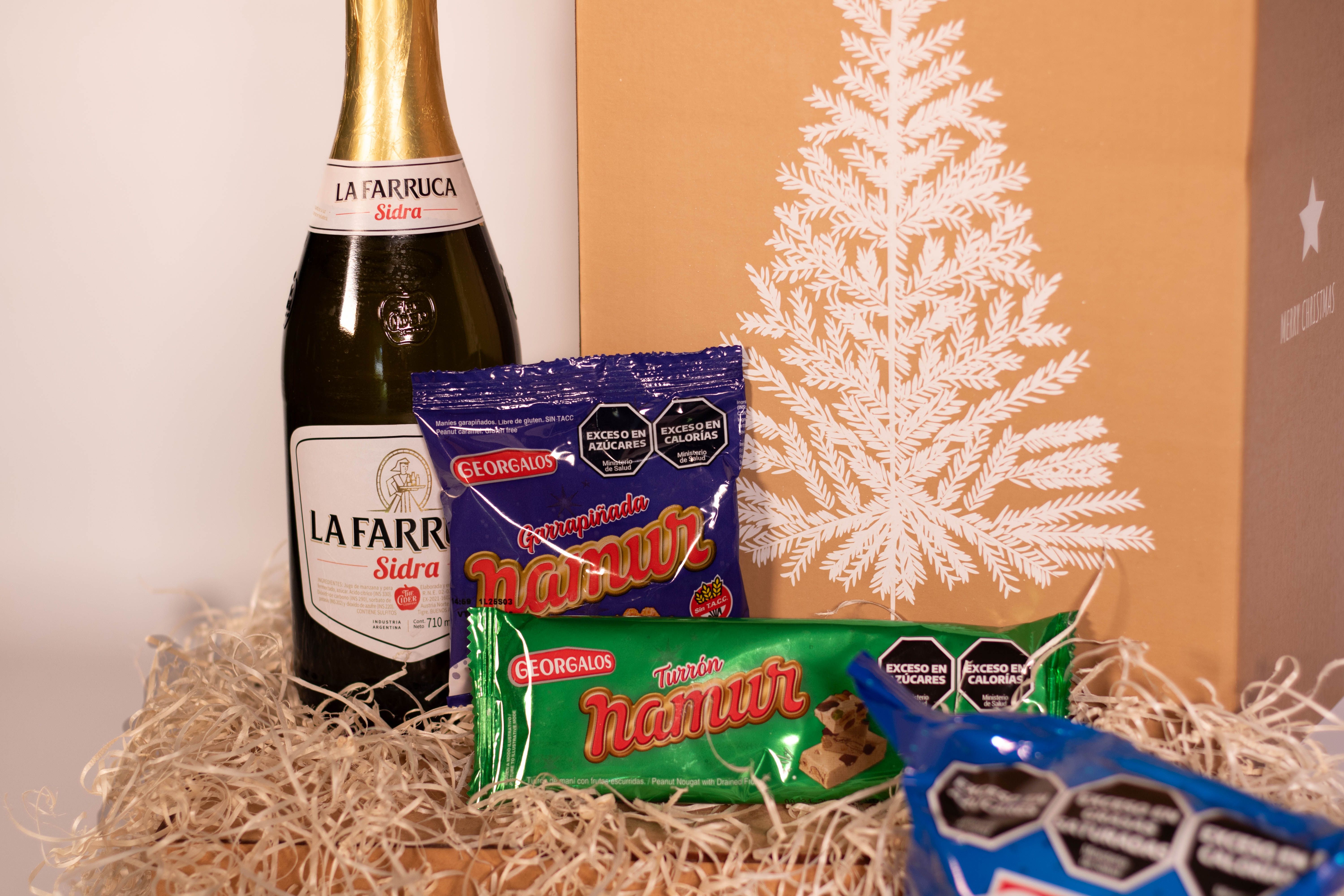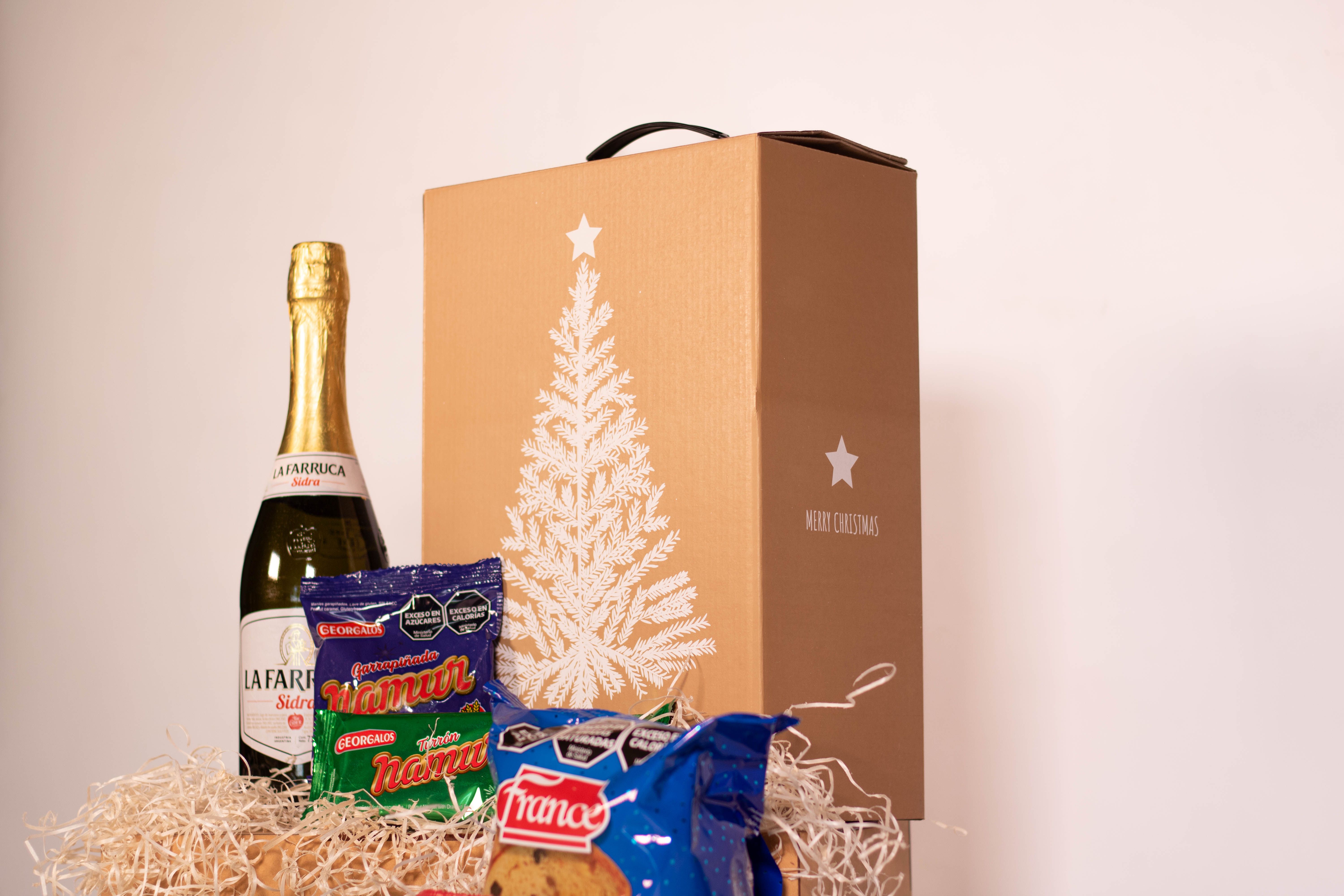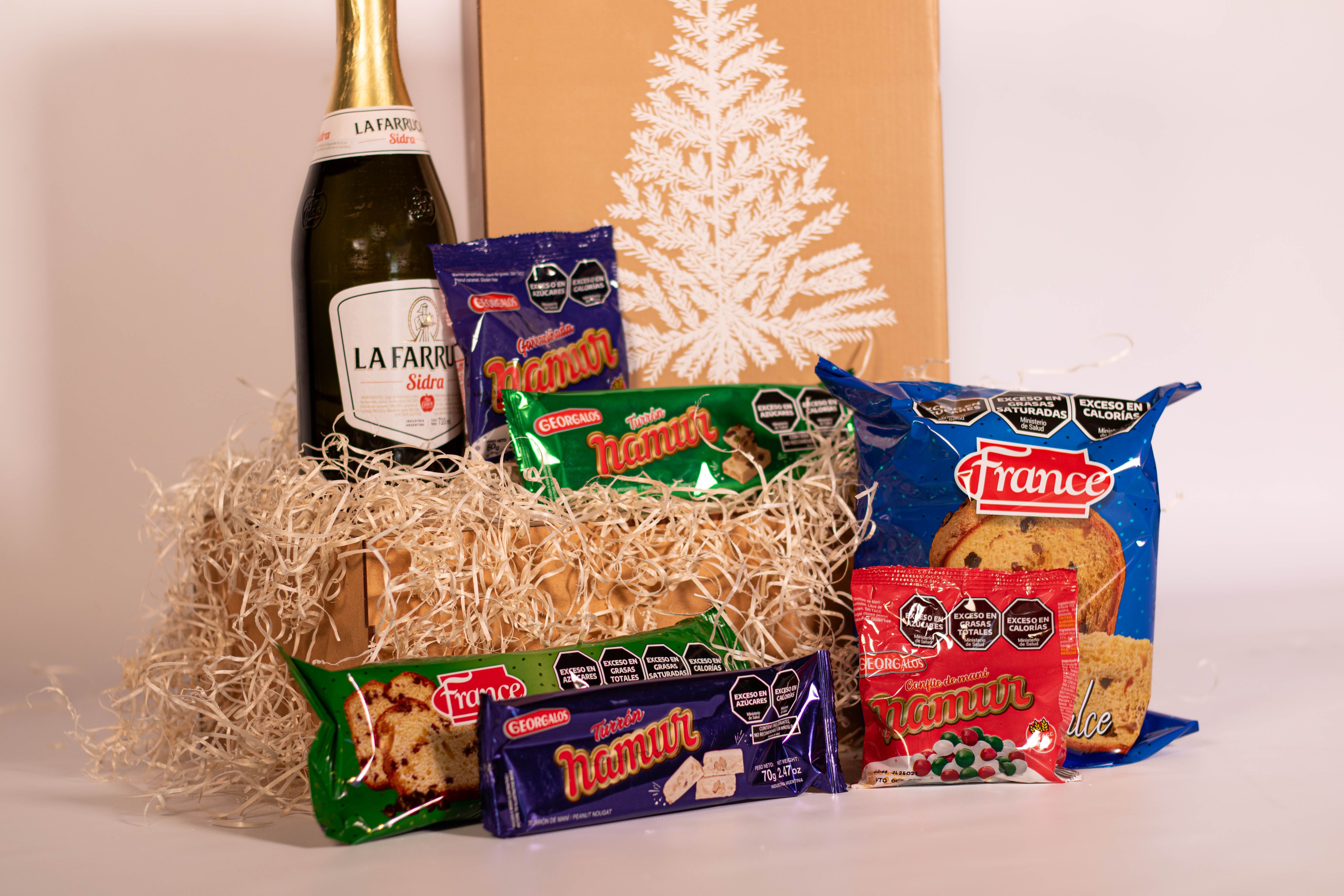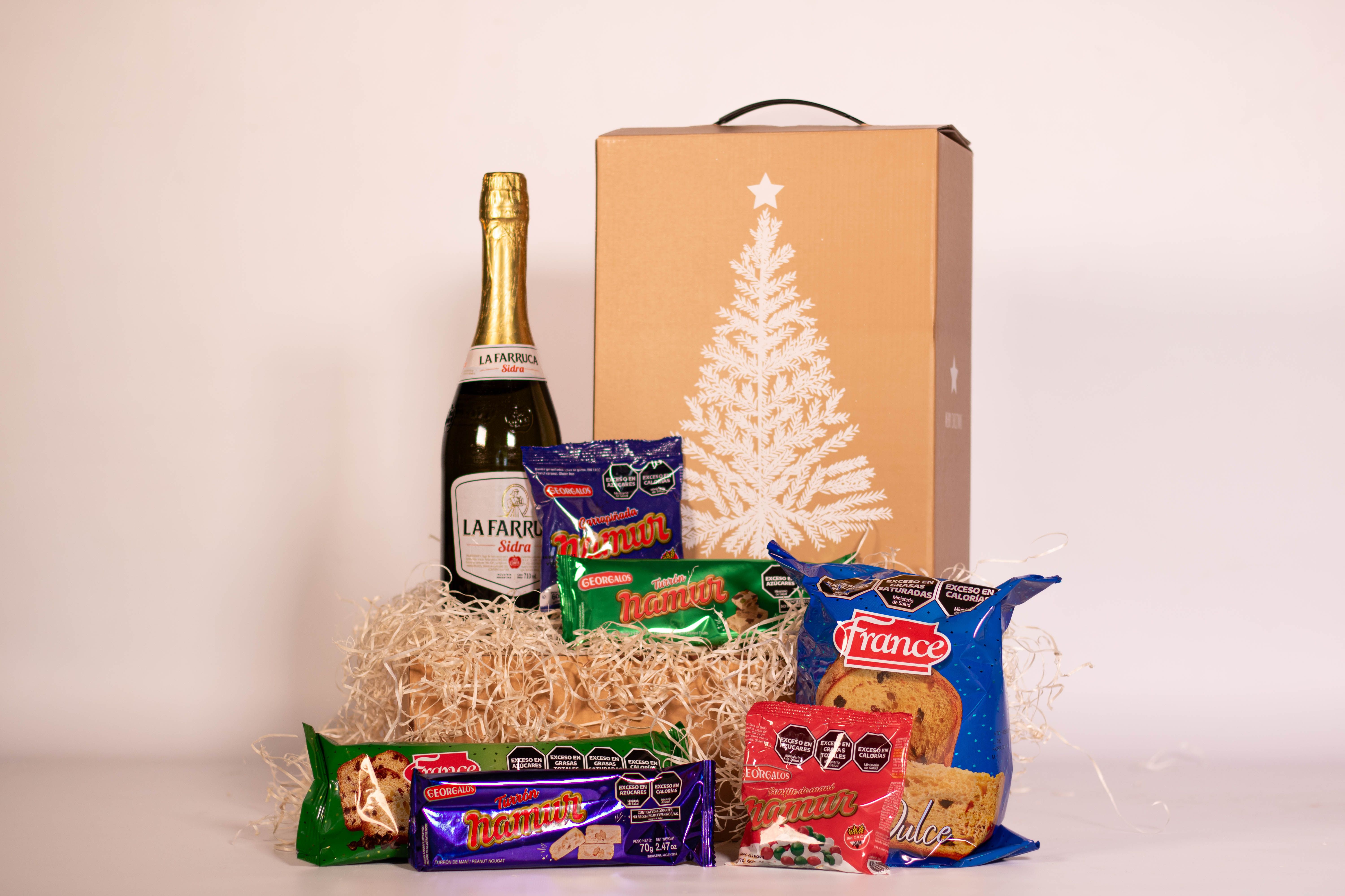 La Caja Arbolito contiene 7 productos detallados a continuación: 1) SIDRA LA FARRUCA x 710cc 2) PAN DULCE FRANCE CON FRUTAS x 400g (Firenze) 3) BUDÍN FRANCE CON CHIPS DE CHOCOLATE x 150g (Firenze) 4) GARRAPIÑADA DE MANÍ NAMUR x 60g (Georgalos) 5) CONFITE DE MANI NAMUR x 80g (Georgalos) 6) TURRÓN DE MANÍ NAMUR x70g (Georgalos) 7) TURRÓN DE MANÍ CON FRUTAS NAMUR x 90g (Georgalos) + CAJA MICRO-CORRUGADO IMPRESA C/MOTIVOS NAVIDEÑOS