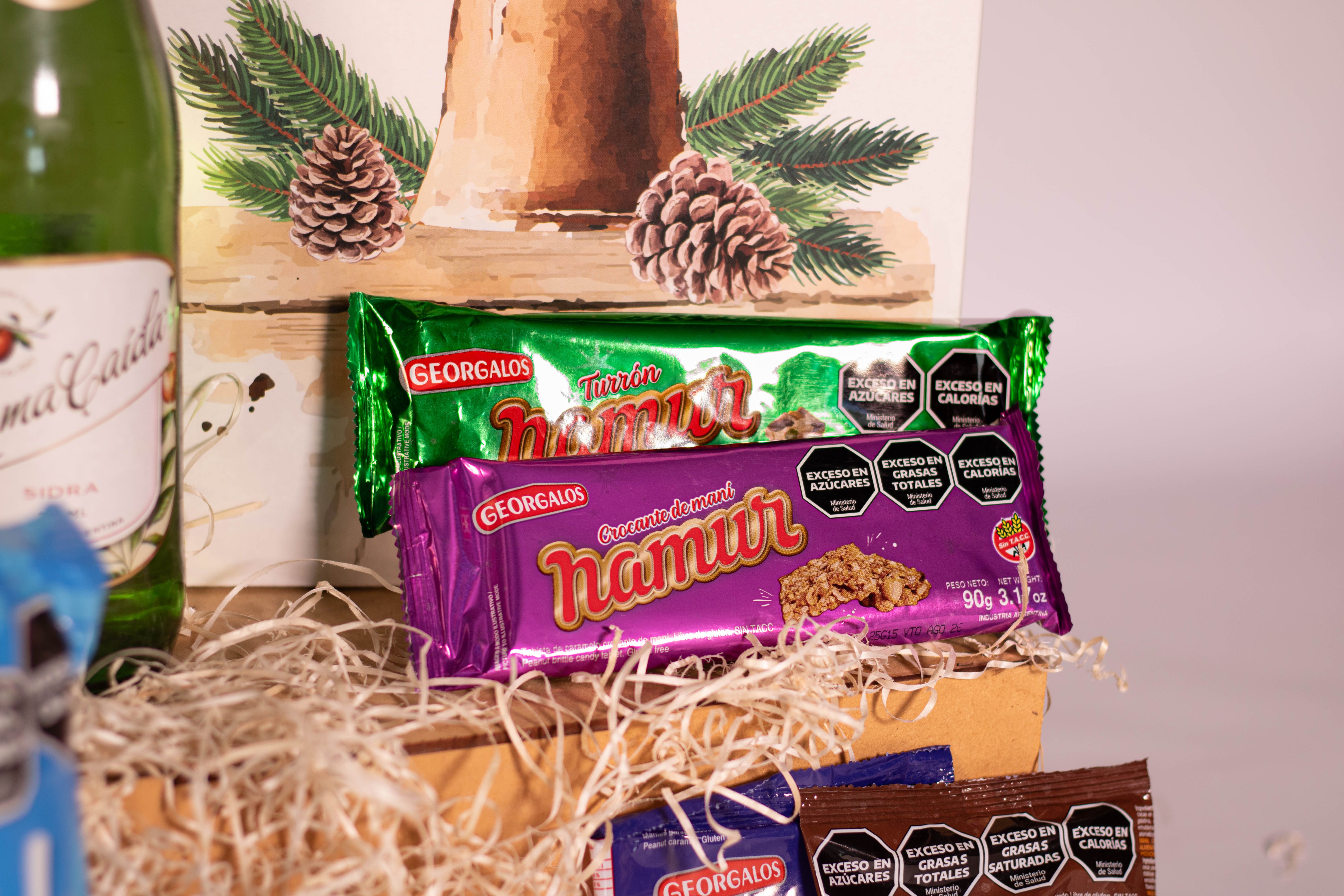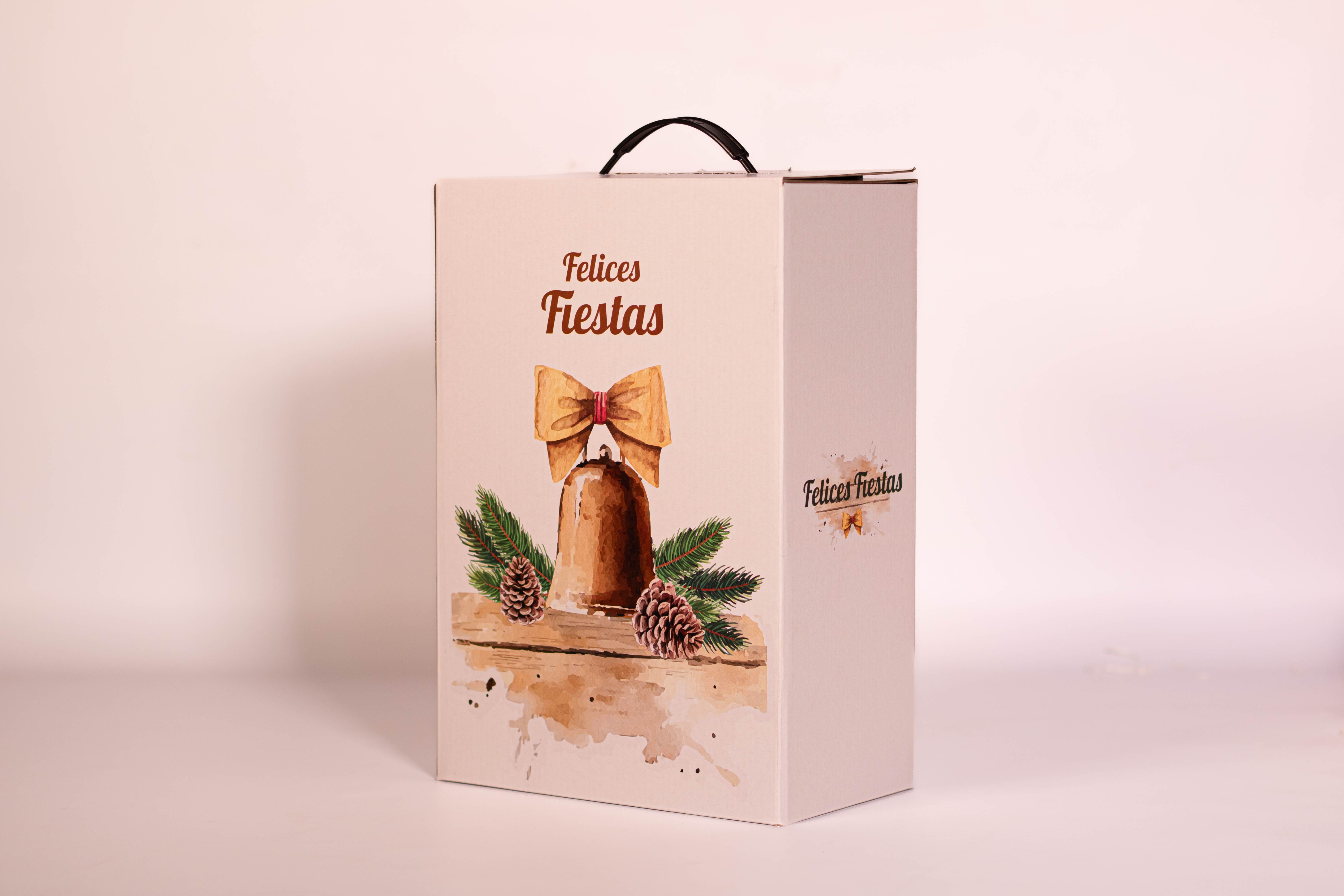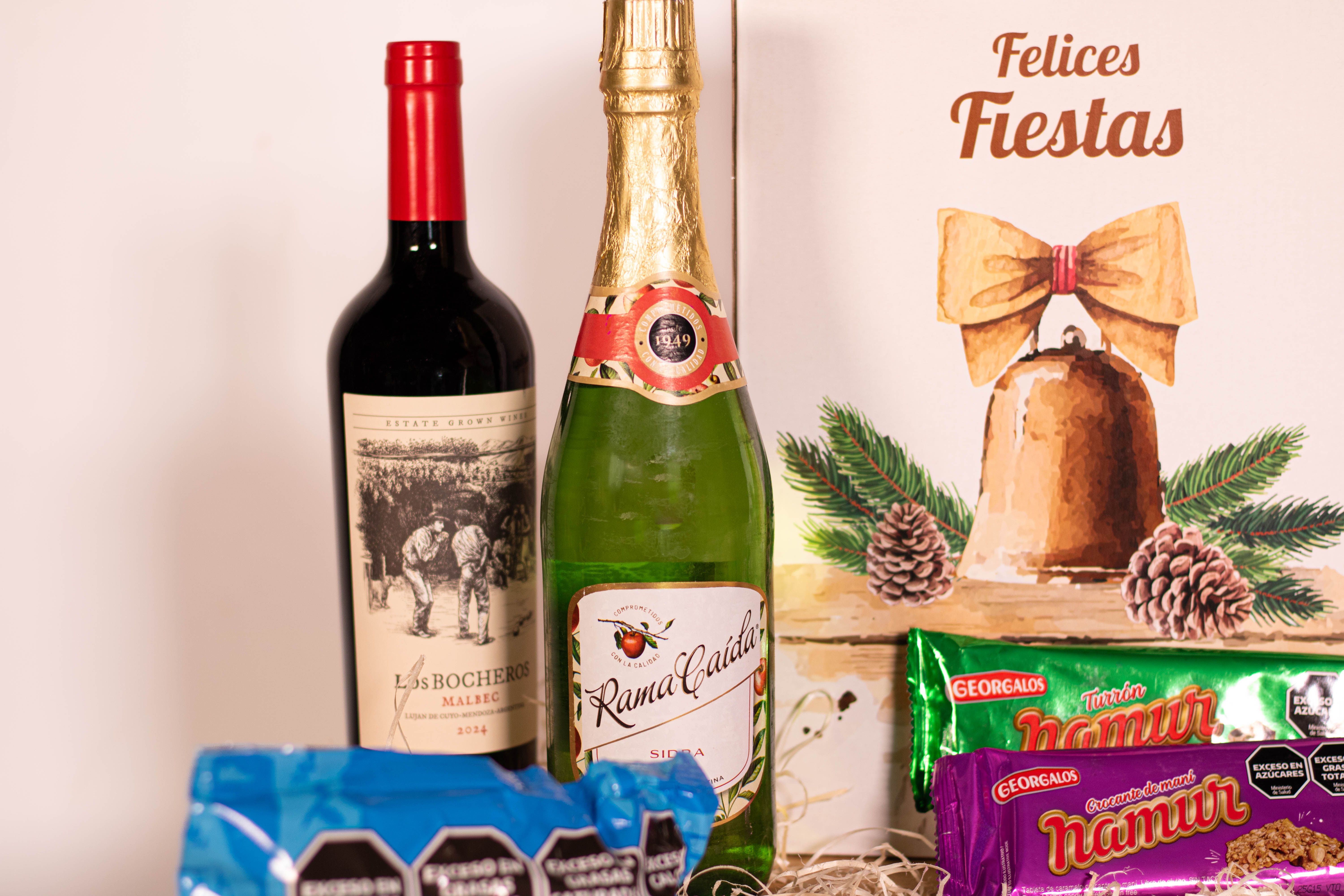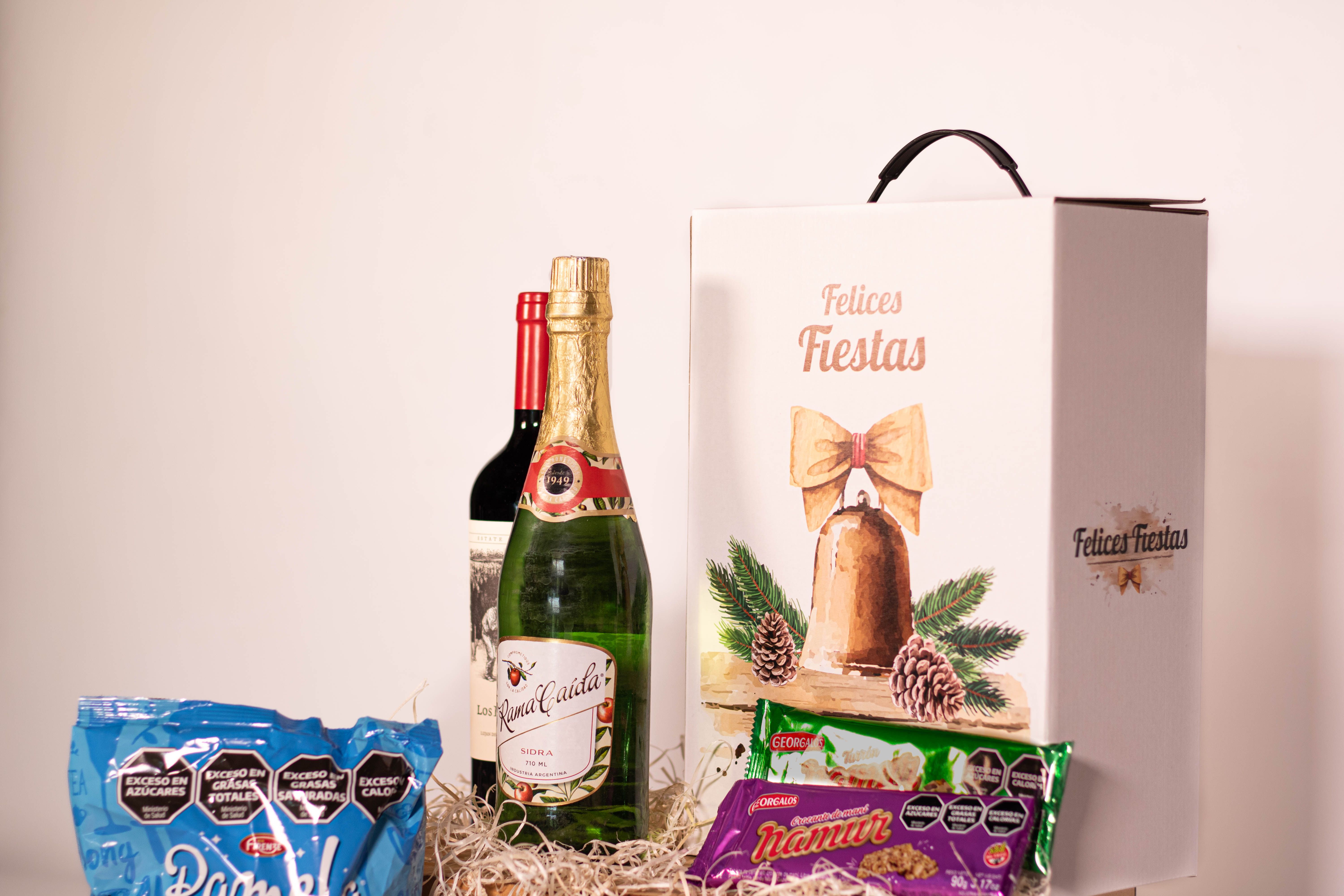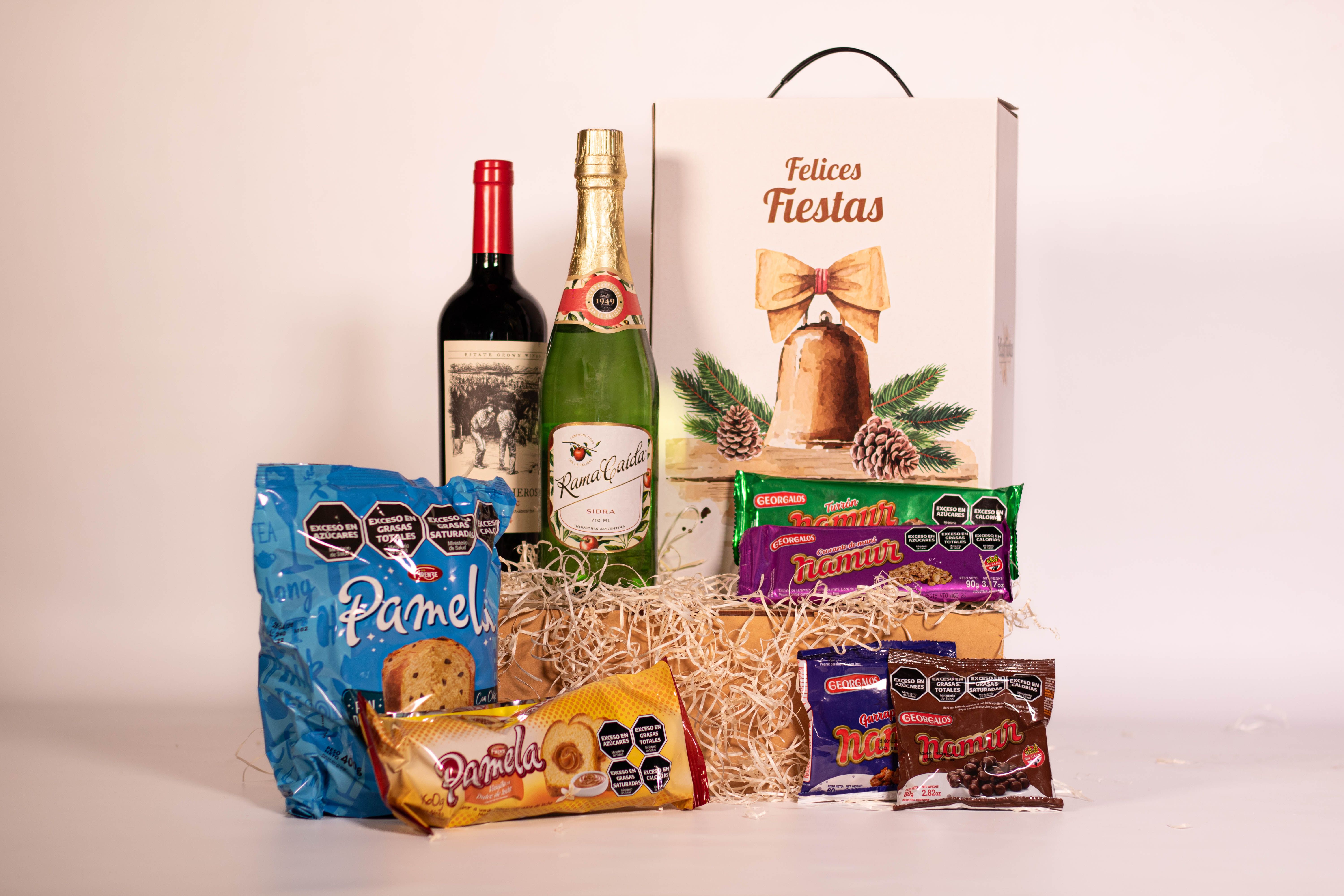 La Caja Campanita contiene 8 productos detallados a continuación: 1) SIDRA RAMA CAIDA x 710 cc 2) LOS BOCHEROS MALBEC - LAMADRID ESTATE WINES 3) PAN DULCE PAMELA CON CHIPS x 400g (Firenze) 4) BUDÍN PAMELA CON DULCE DE LECHE x 160g (Firenze) 5) GARRAPIÑADA DE MANÍ NAMUR x 60g (Georgalos) 6) MANI CON CHOCOLATE NAMUR x 80g (Georgalos) 7) TURRÓN DE MANÍ CON FRUTAS NAMUR x 90g (Georgalos) 8) TABLETA CROCANTE DE MANÍ NAMUR x 90g (Georgalos) + CAJA MICRO-CORRUGADO IMPRESA C/MOTIVOS NAVIDEÑOS