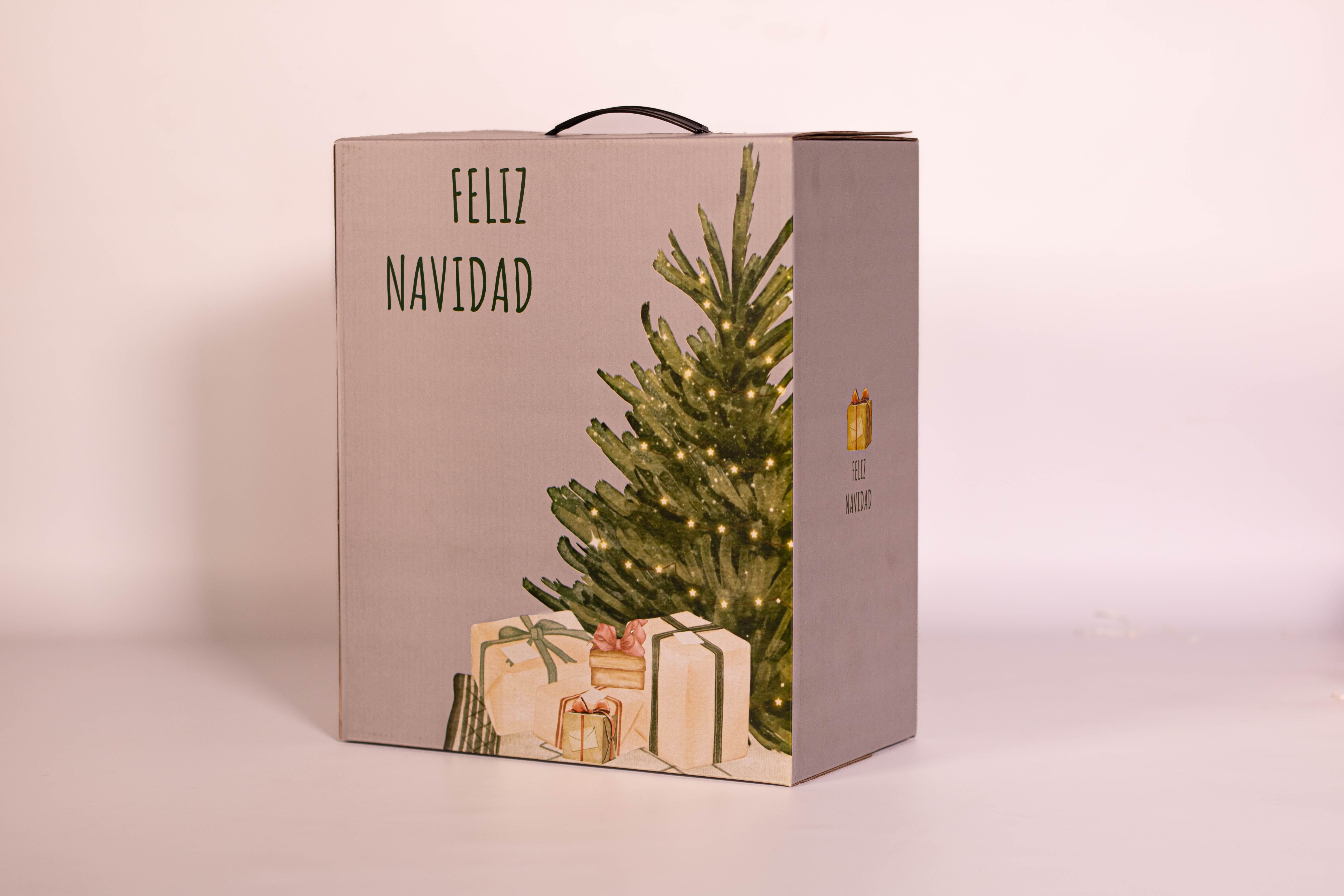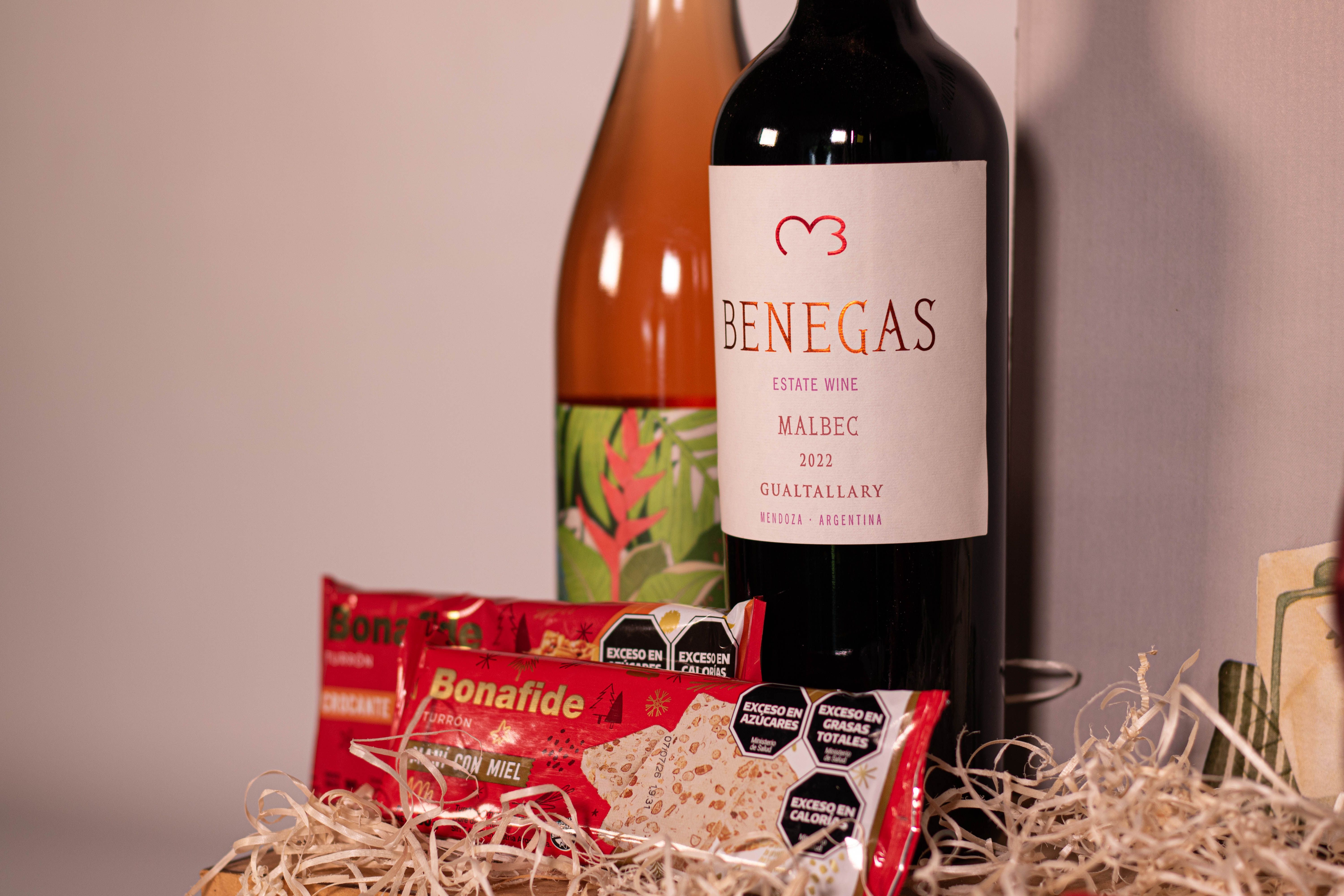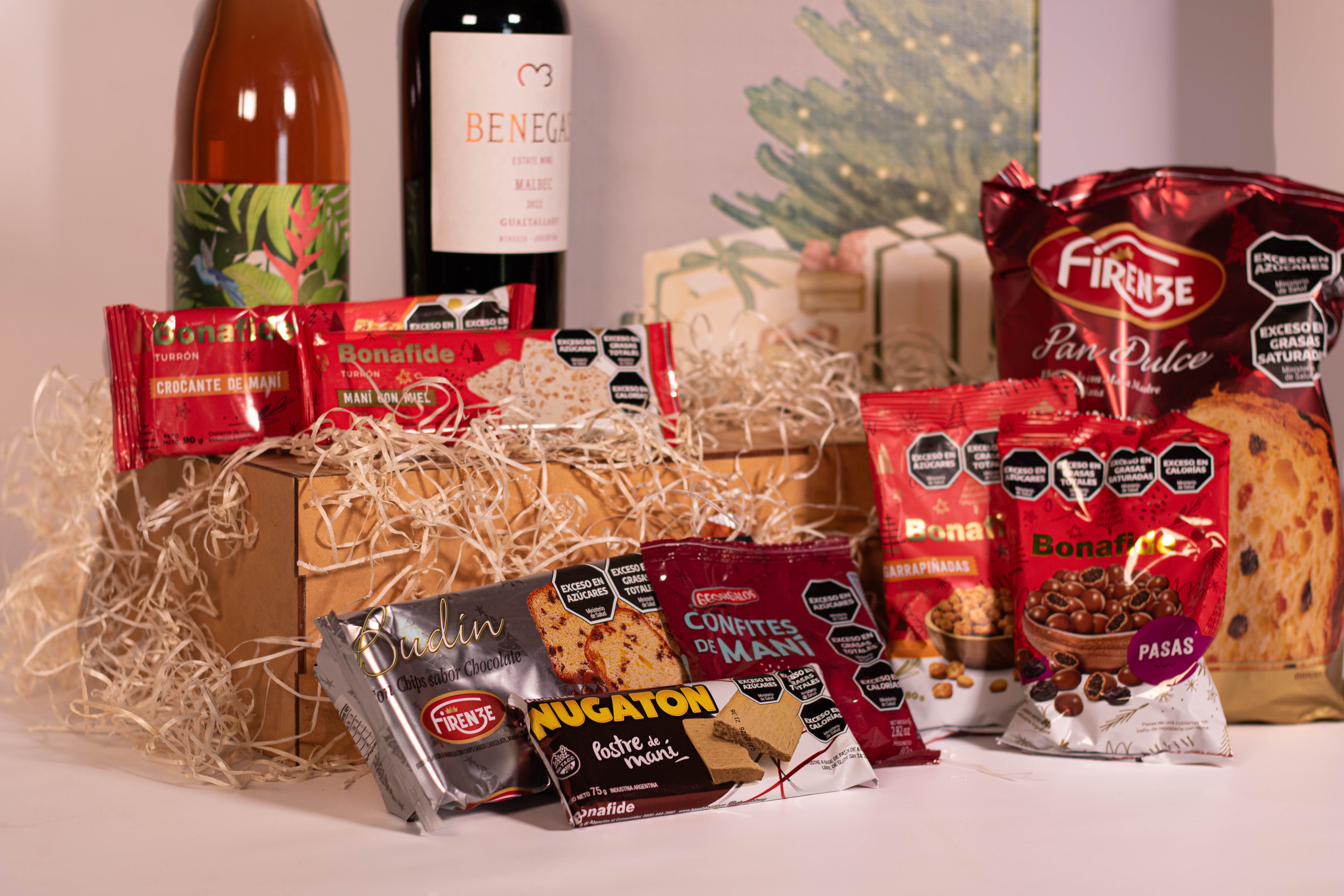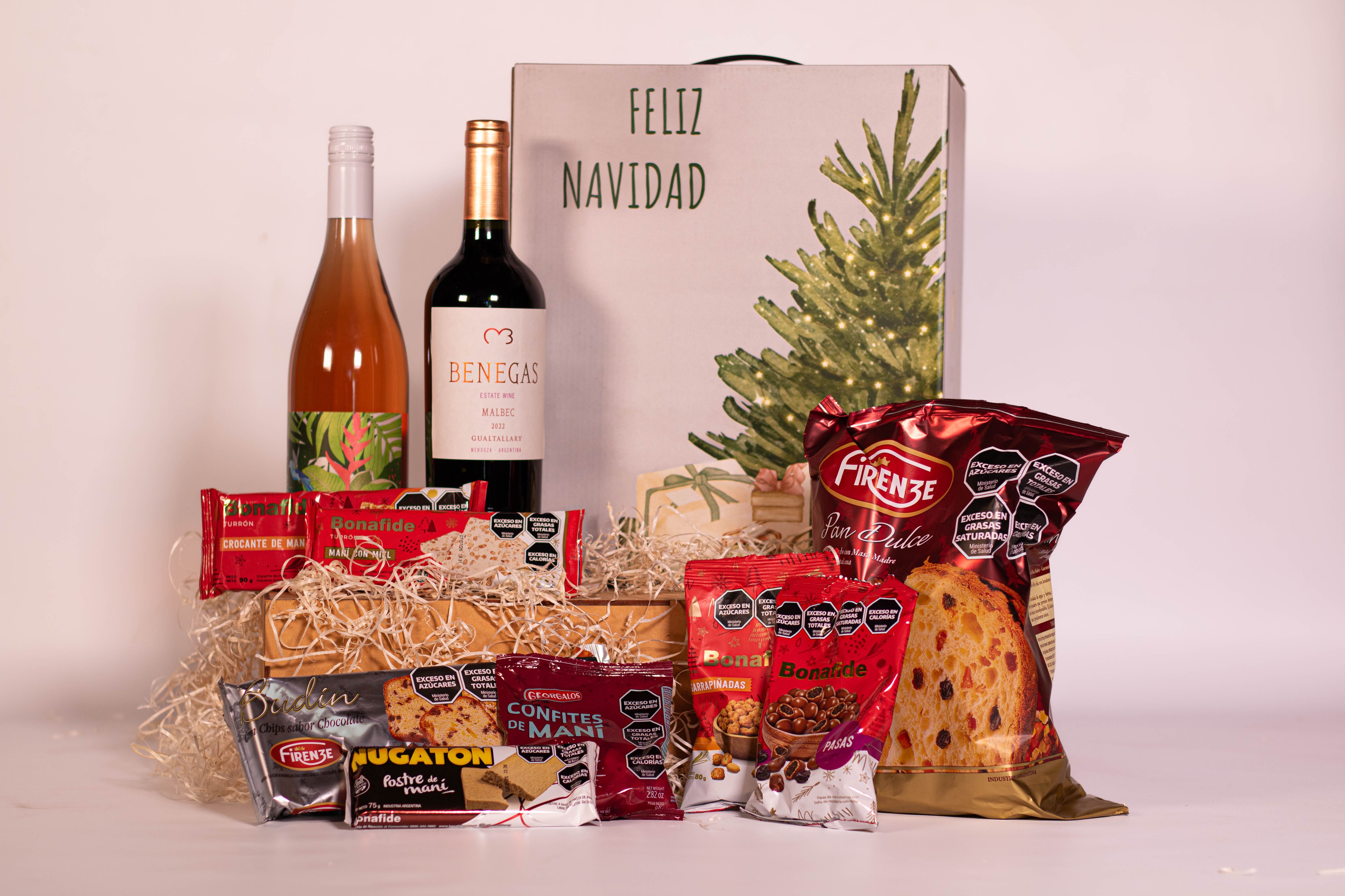 La Caja Felicidad contiene 10 productos detallados a continuación: 1) JUAN BENEGAS MALBEC x 750cc - BENEGAS WINERY 2) ZUNZUN ROSADO DE CABERNET FRANC x 750cc - LAMADRID ESTATE WINES 3) PAN DULCE PANETTONE CON FRUTAS FIRENZE x 500g 4) BUDIN FIRENZE CON CHIPS DE CHOCOLATE x 200g 5) GARRAPIÑADA MANI BONAFIDE x 80 g 6) CONFITES DE MANÍ GEORGALOS x 80g 7) PASAS DE UVA CON CHOCOLATE BONAFIDE x 80g 8) TABLETA CROCANTE de MANÍ BONAFIDE x 90g 9) POSTRE NUGATON x 75g 10) TURRÓN MANI CON MIEL BONAFIDE x 100g + CAJA MICRO-CORRUGADO IMPRESA C/MOTIVOS NAVIDEÑOS