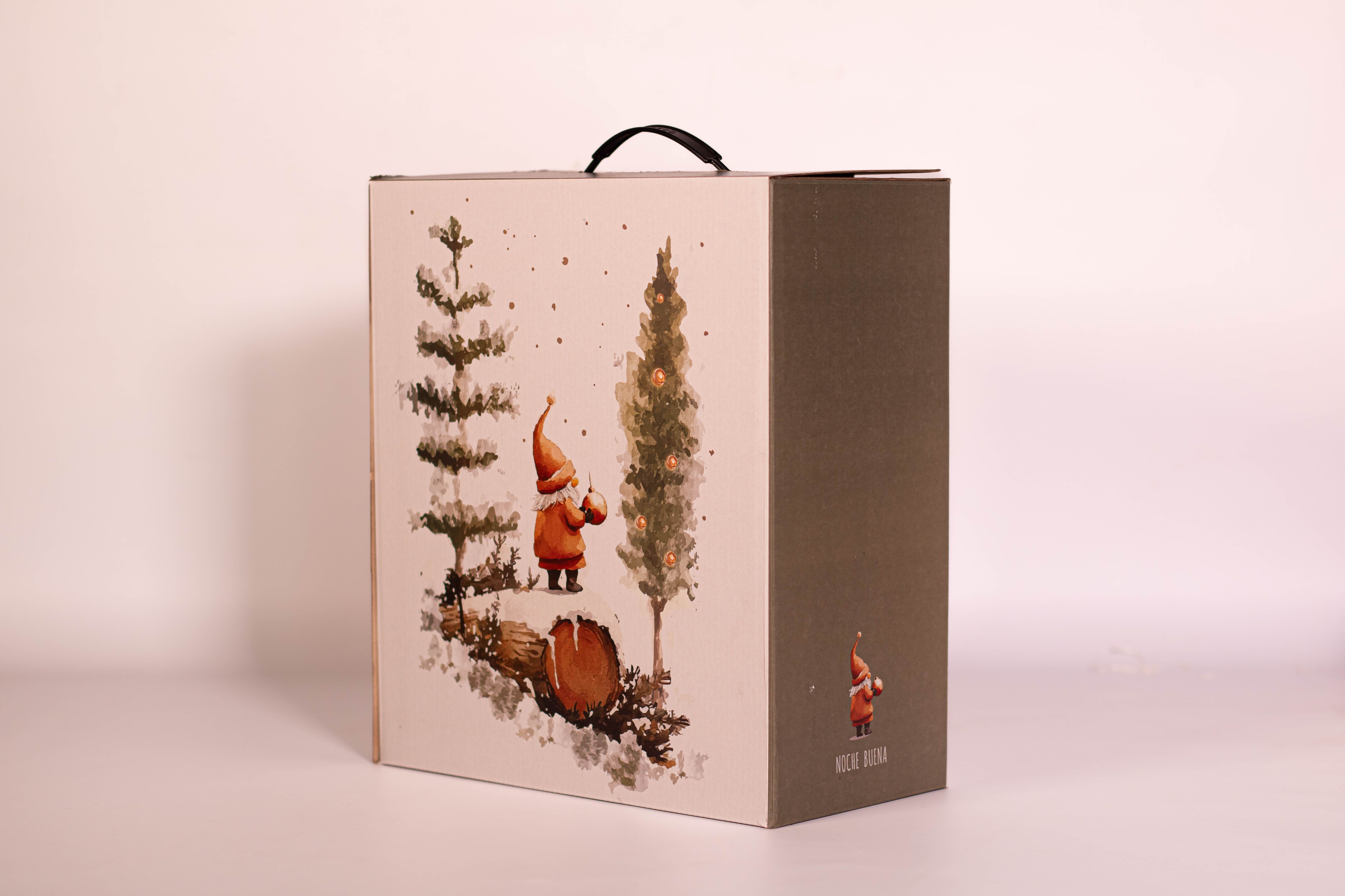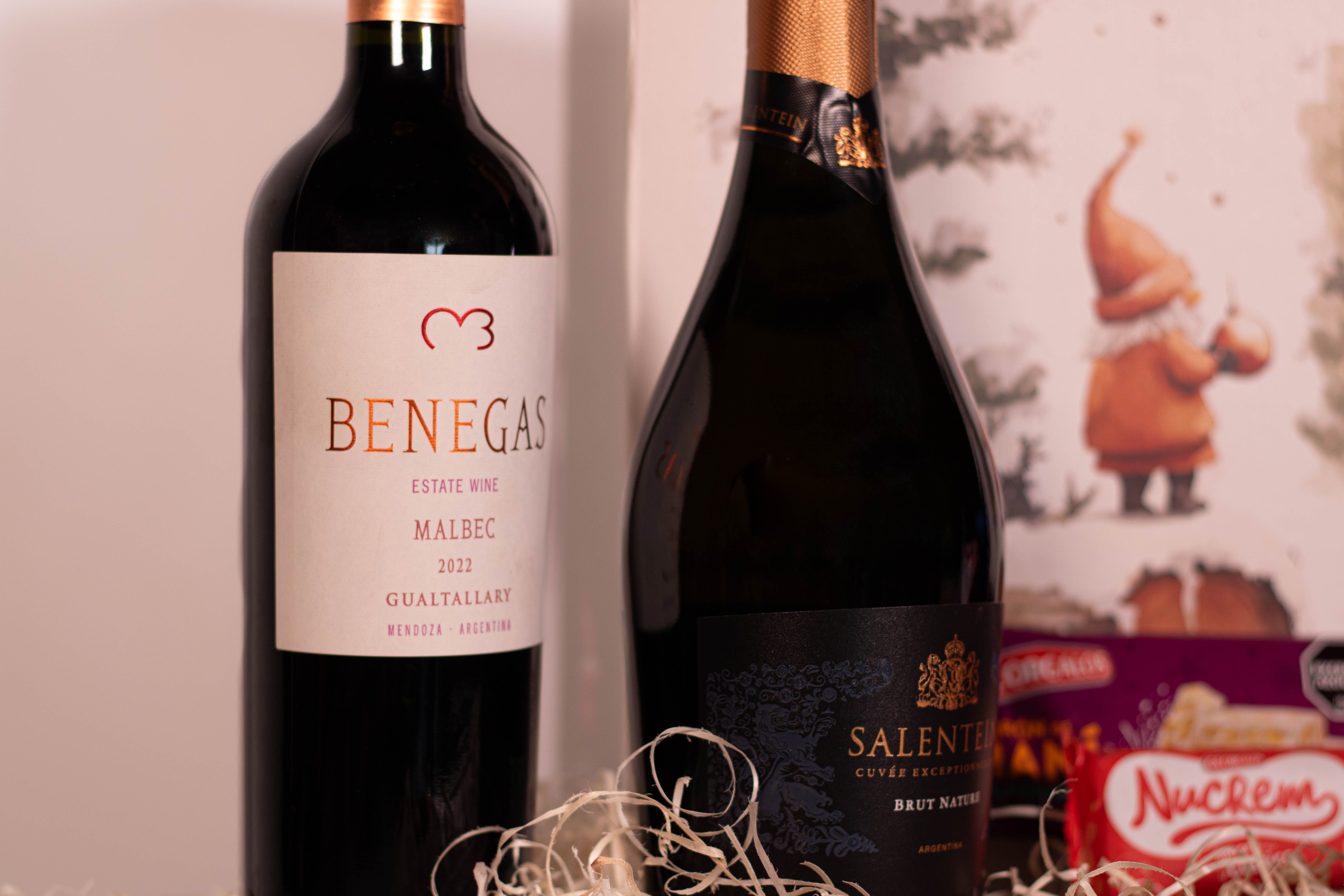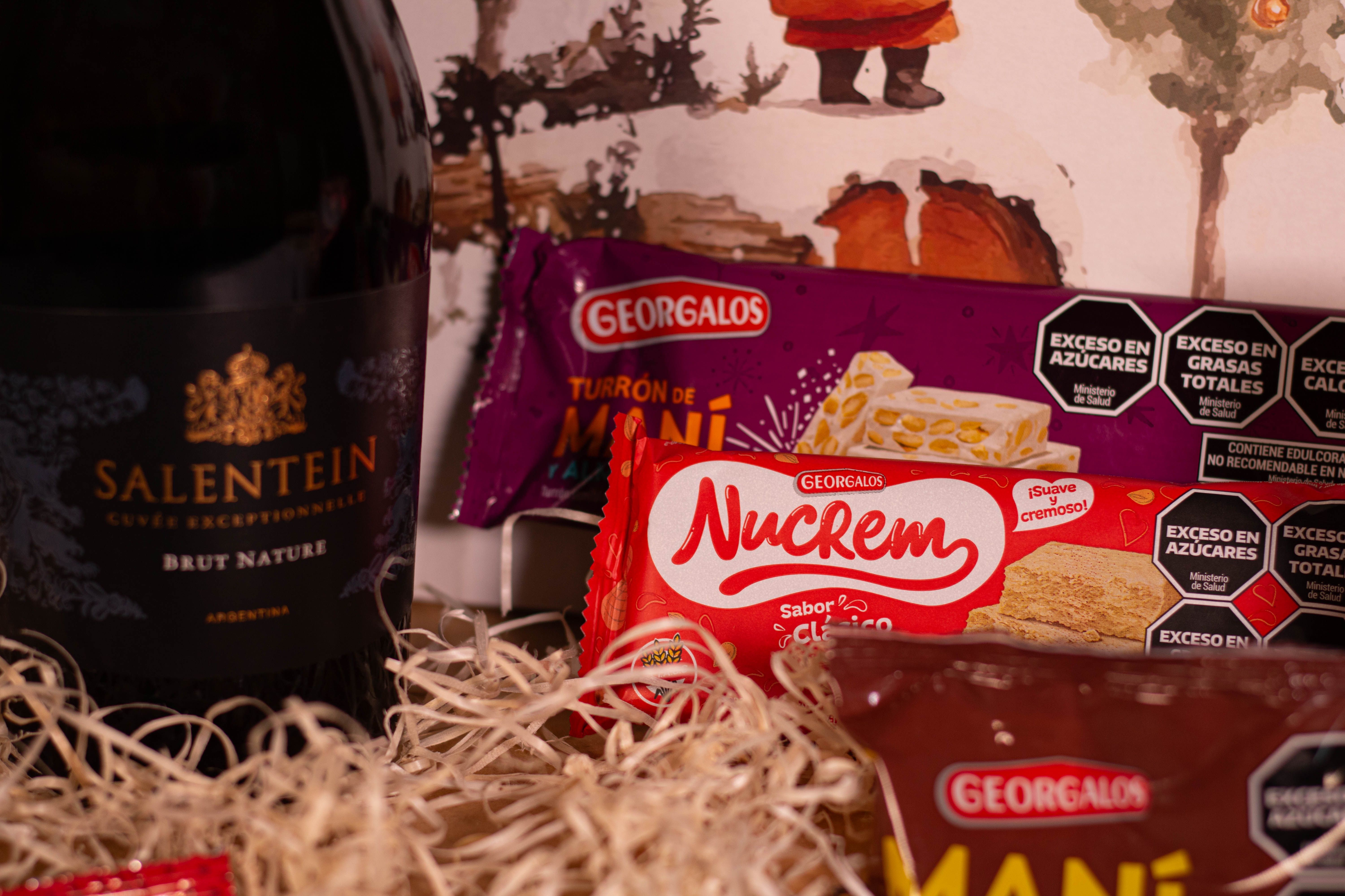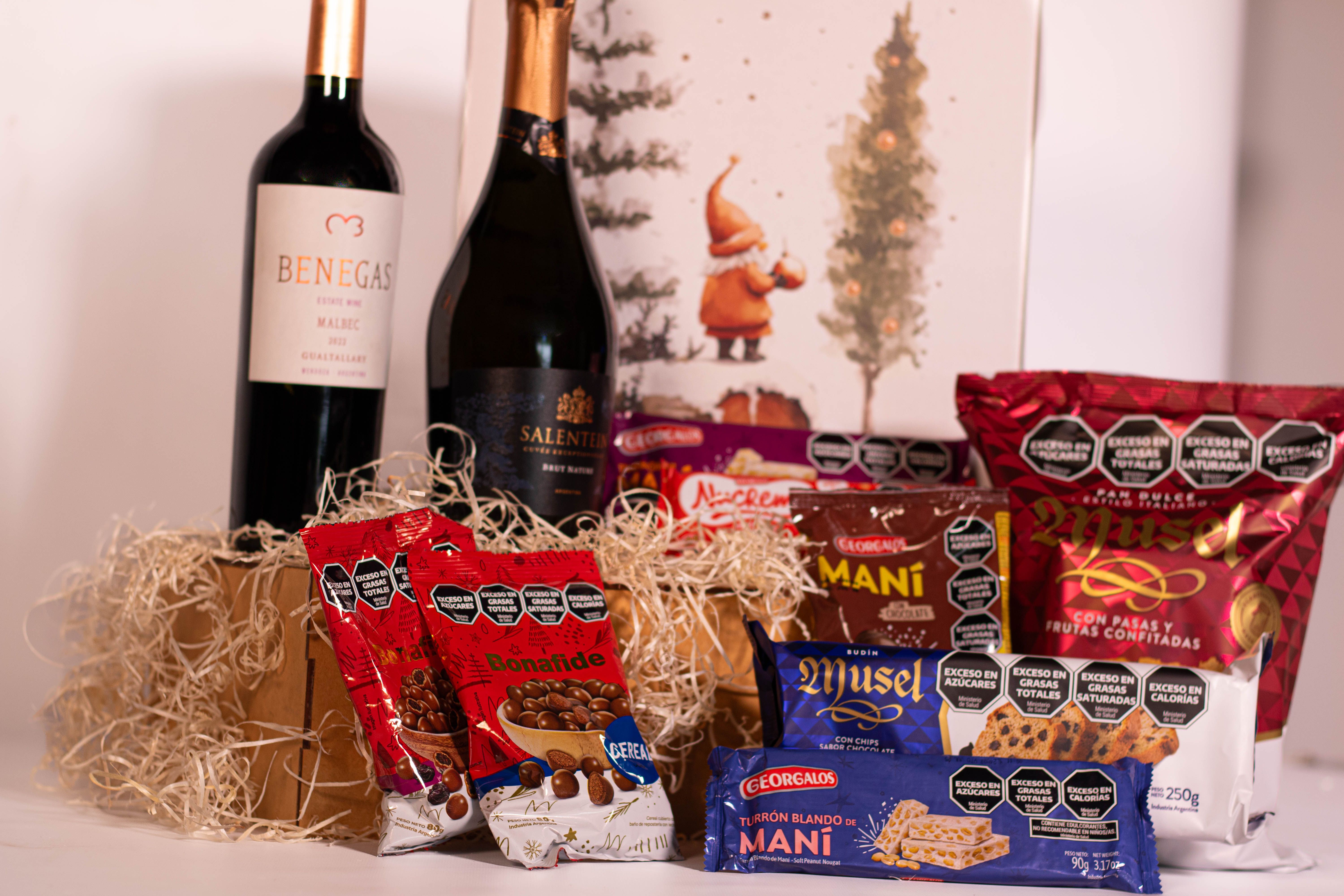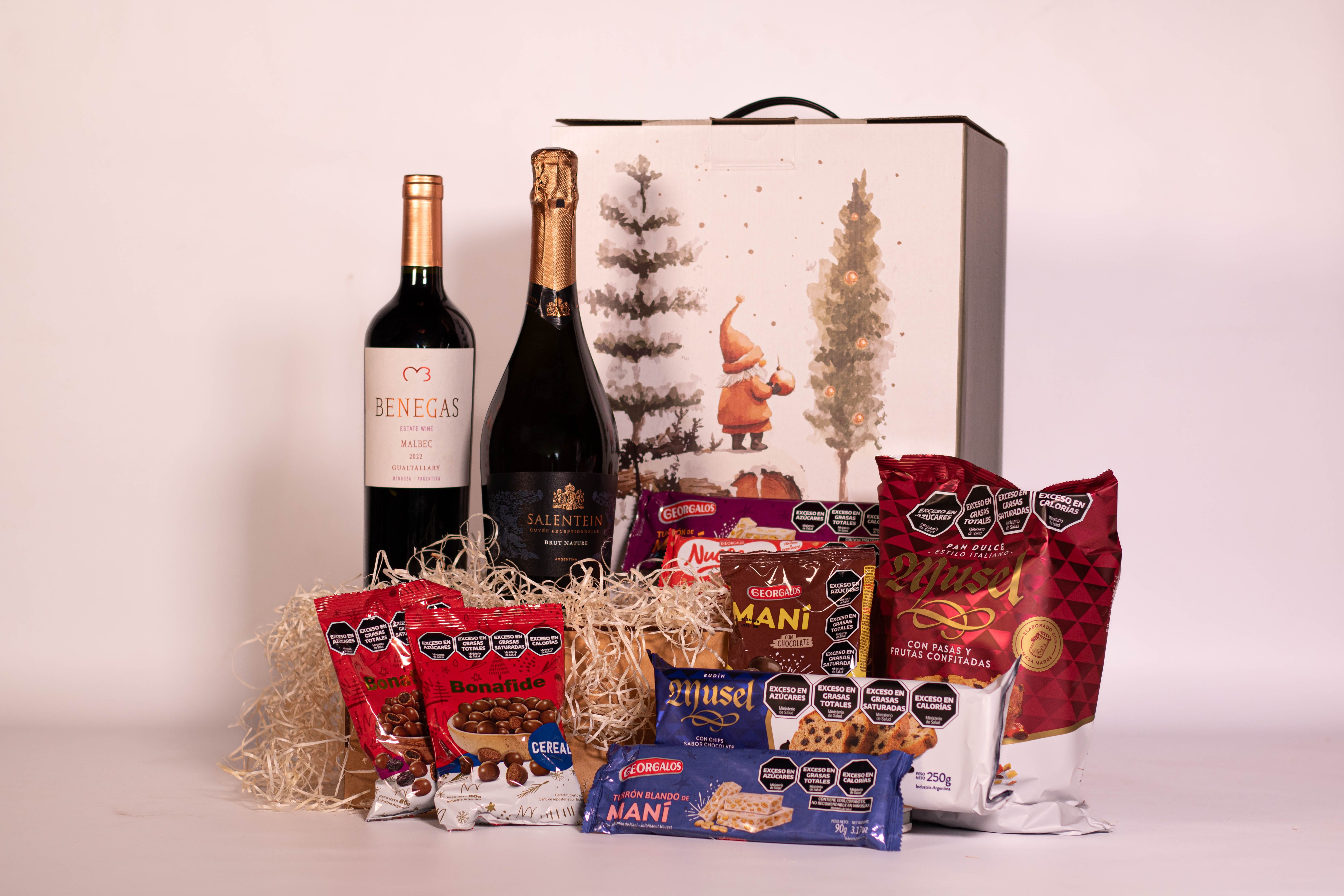 La Caja Noche Buena contiene 10 productos detallados a continuación: 1) ESPUMANTE SALENTEIN BRUT NATURE x 750cc 2) BENEGAS ESTATE RESERVA MALBEC x 750cc 3) PAN DULCE PANETTONE CON FRUTAS MUSEL x 500g 4) BUDÍN MUSEL CON CHIPS DE CHOCOLATE x 250g 5) PASAS DE UVA CON CHOCOLATE BONAFIDE x 80g 6) MANI CON CHOCOLATE GEORGALOS x 80g 7) CEREAL CON CHOCOLATE BONAFIDE x 80g 8) POSTRE NUCREM x 84g 9) TURRÓN DE MANI BLANDO GEORGALOS x 90g 10) TURRÓN DE MANI Y ALMENDRAS GEORGALOS x 80g + CAJA MICRO-CORRUGADO IMPRESA C/MOTIVOS NAVIDEÑOS