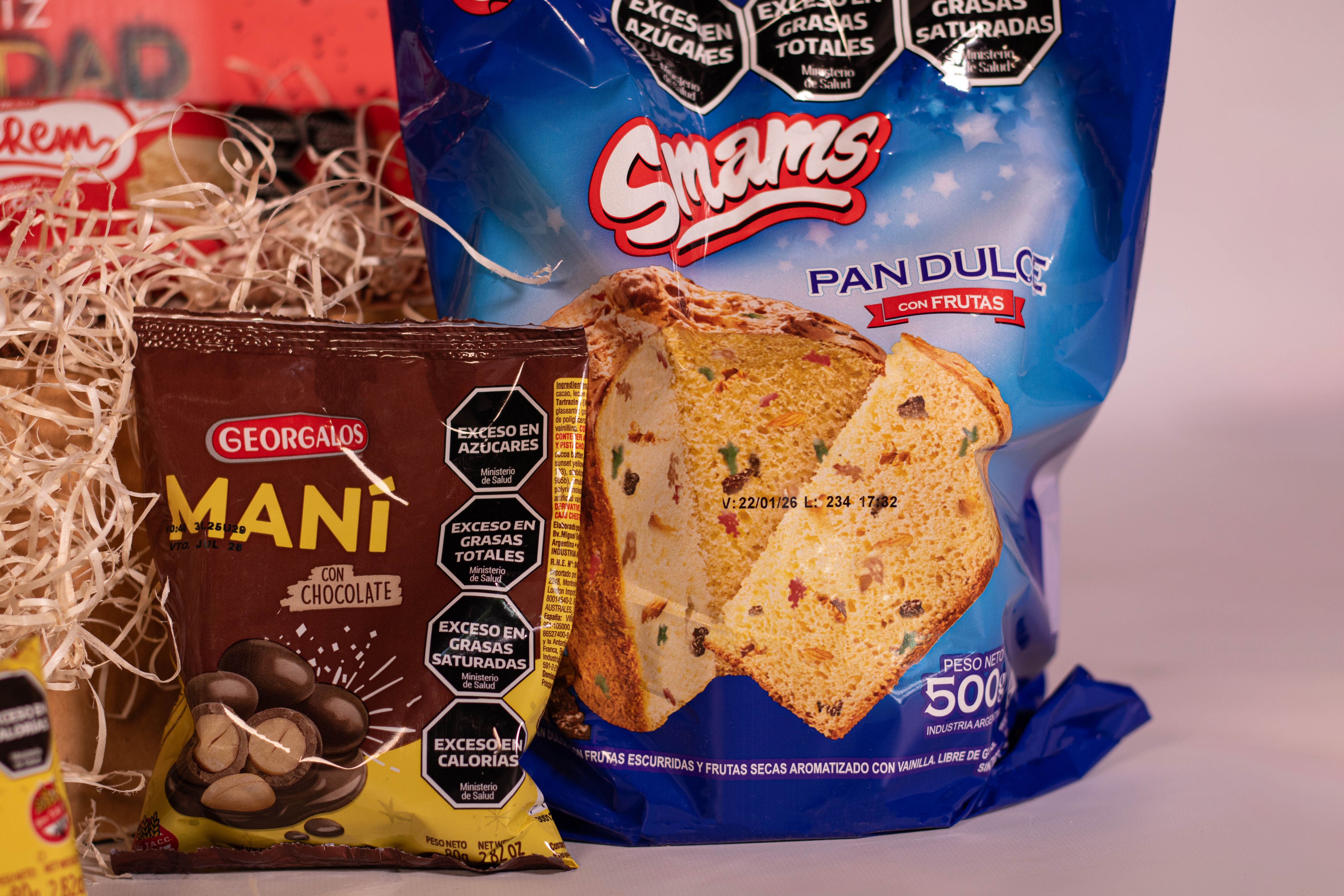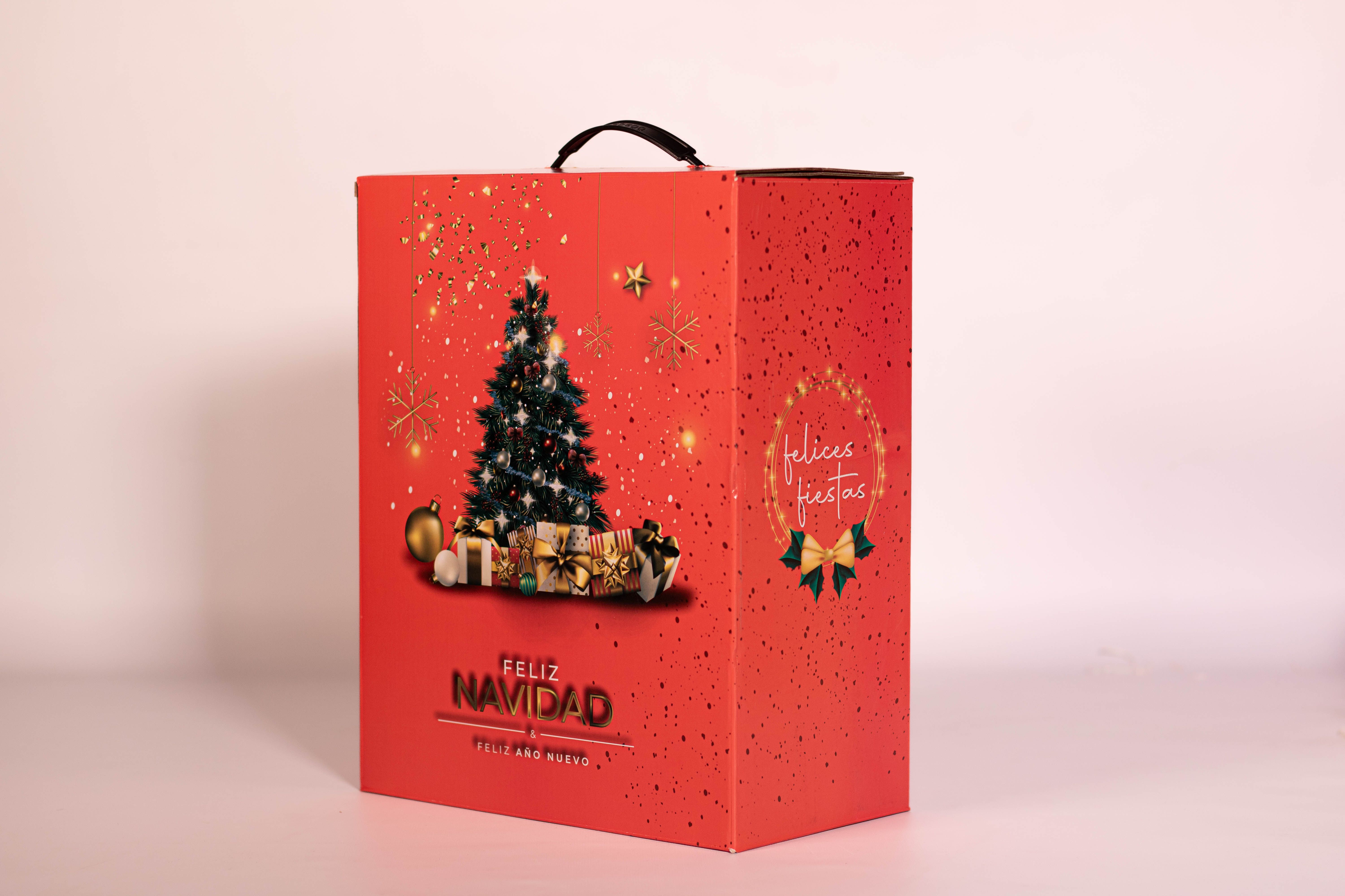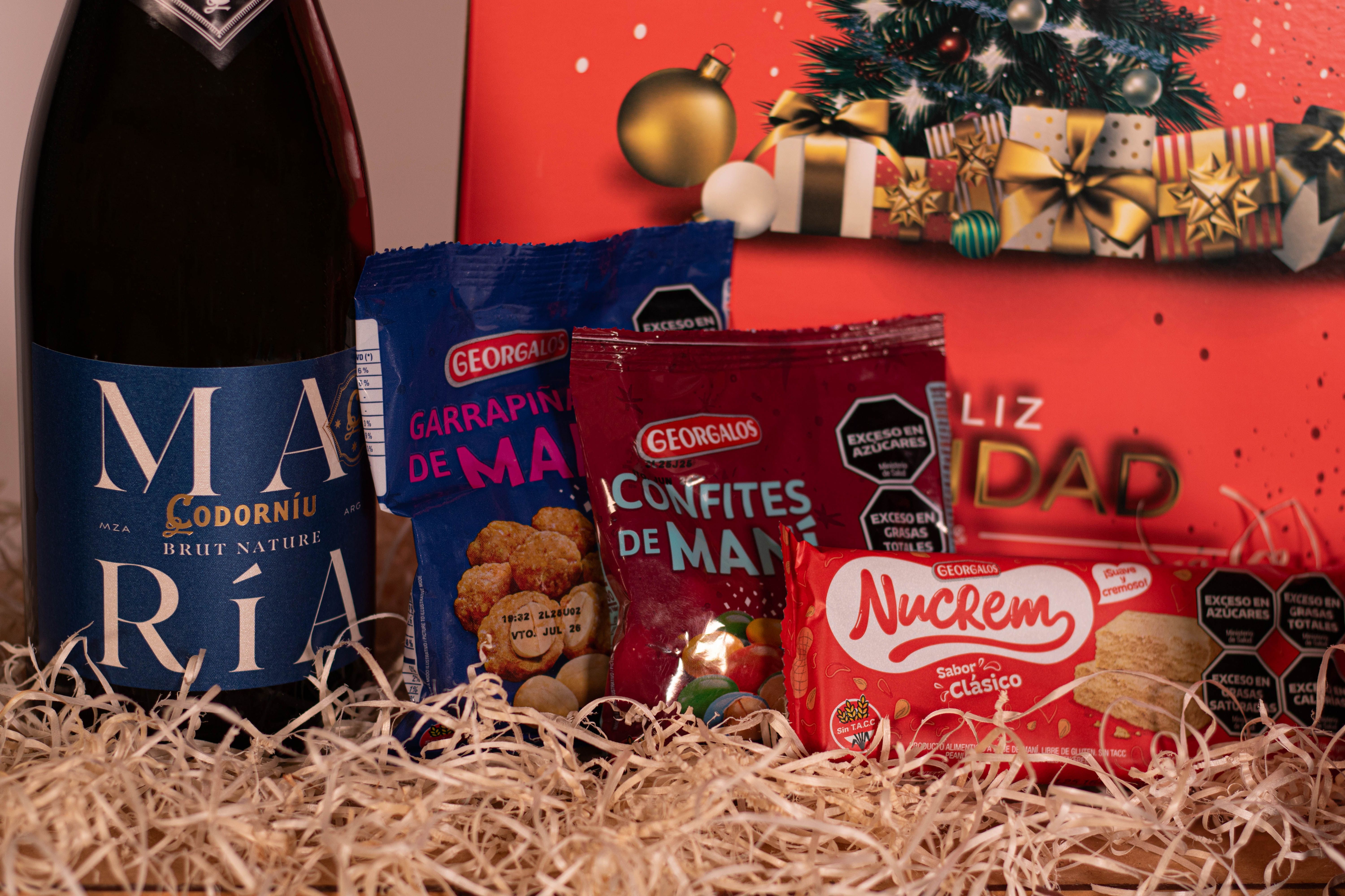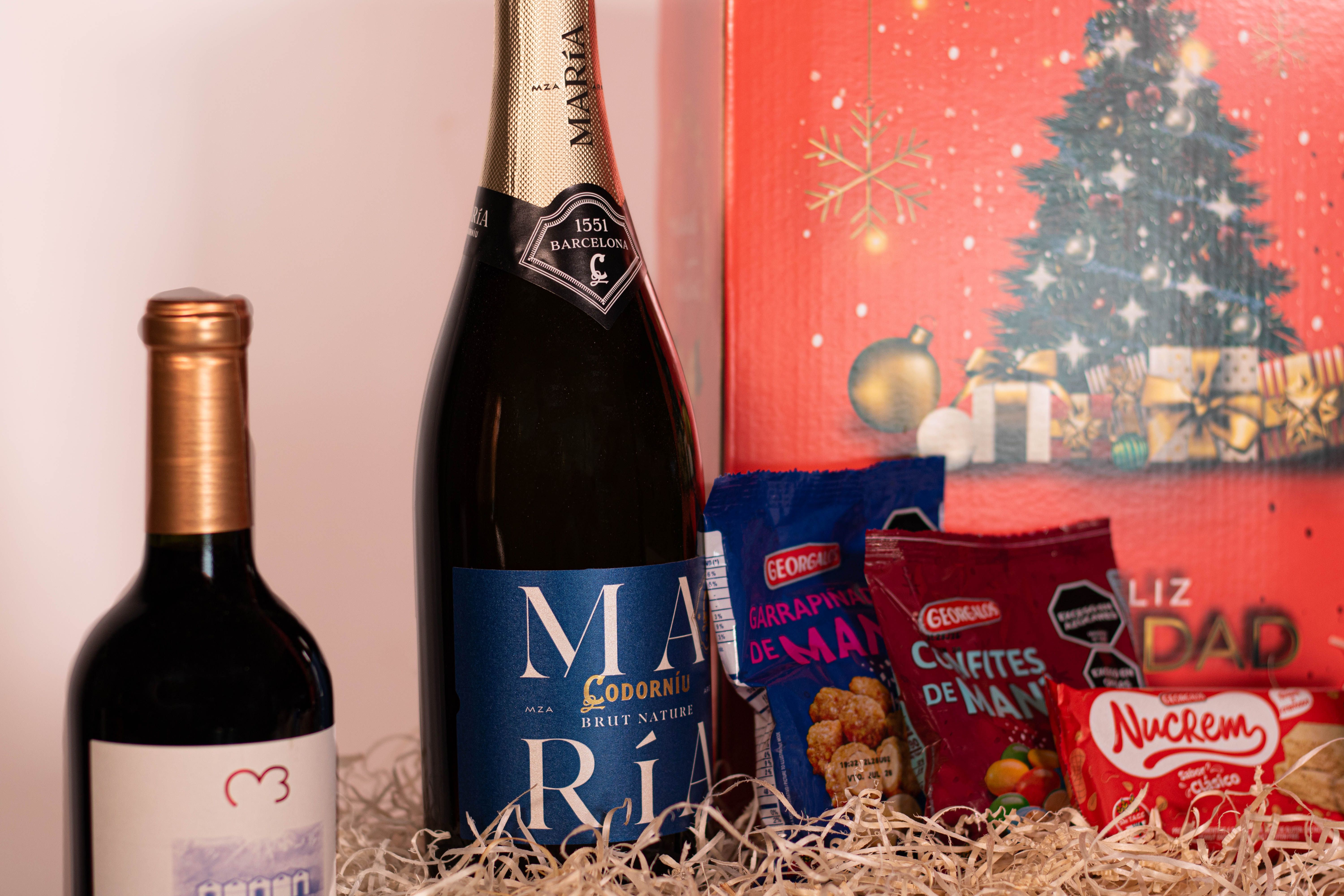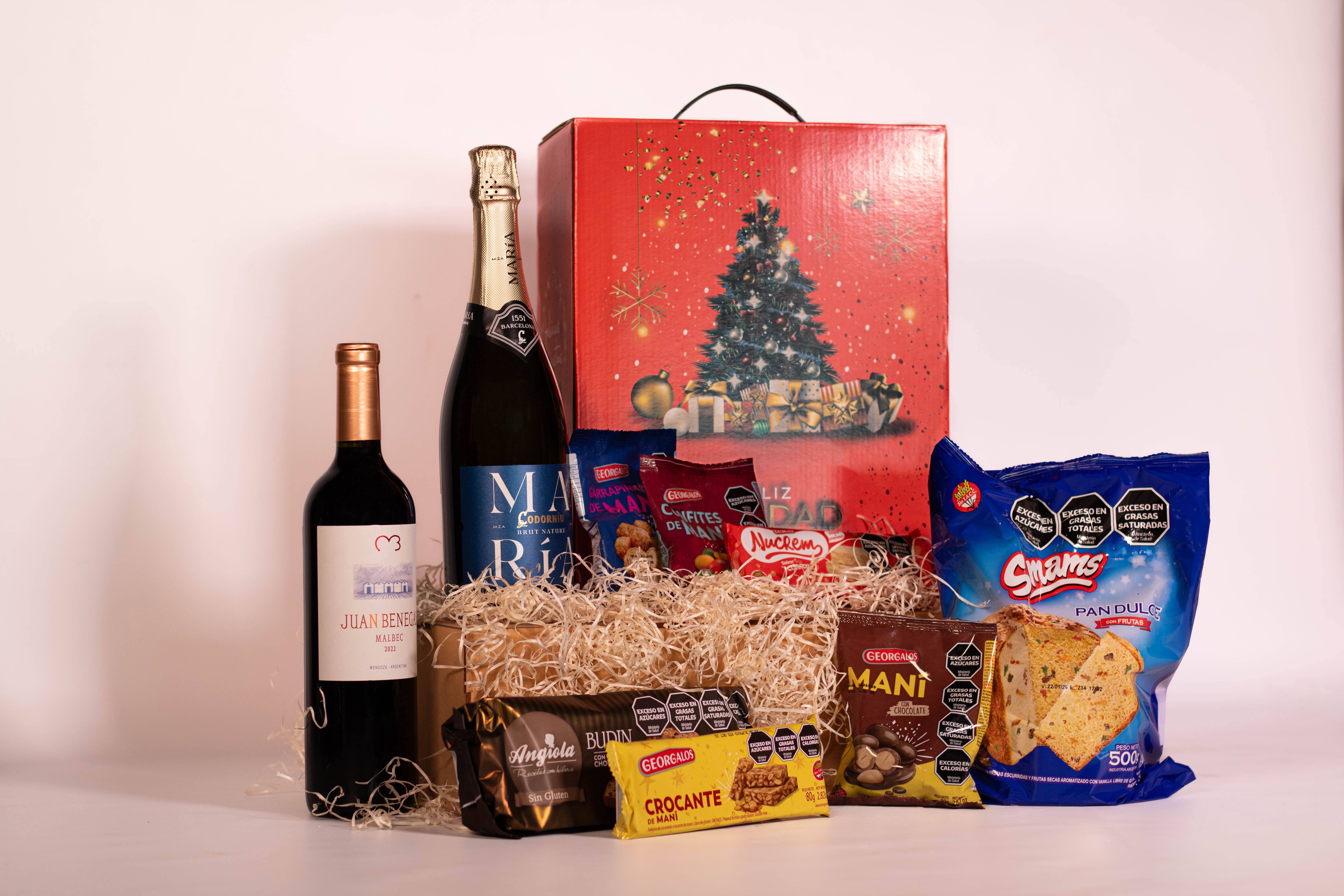 La Caja Sin TACC Nro3 contiene 9 productos detallados a continuación: 1) ESPUMANTE MARIA CODORNIU BRUT NATURE x 750cc 2) JUAN BENEGAS MALBEC x 750cc - BENEGAS WINERY 3) PAN DULCE SIN TACC x 500g - SMAMS 4) BUDÍN CON CHIPS DE CHOCOLATE SIN TACC ANGIOLA x 200g 5) GARRAPIÑADA DE MANI GEORGALOS x 80g 6) POSTRE NUCREM x 84g 7) CONFITE DE MANI GEORGALOS x 80g 8) MANI CON CHOCOLATE GEORGALOS x 80g 9) TURRON CROCANTE DE MANI GEORGALOS x 80g + CAJA MICRO-CORRUGADO IMPRESA C/MOTIVOS NAVIDEÑOS