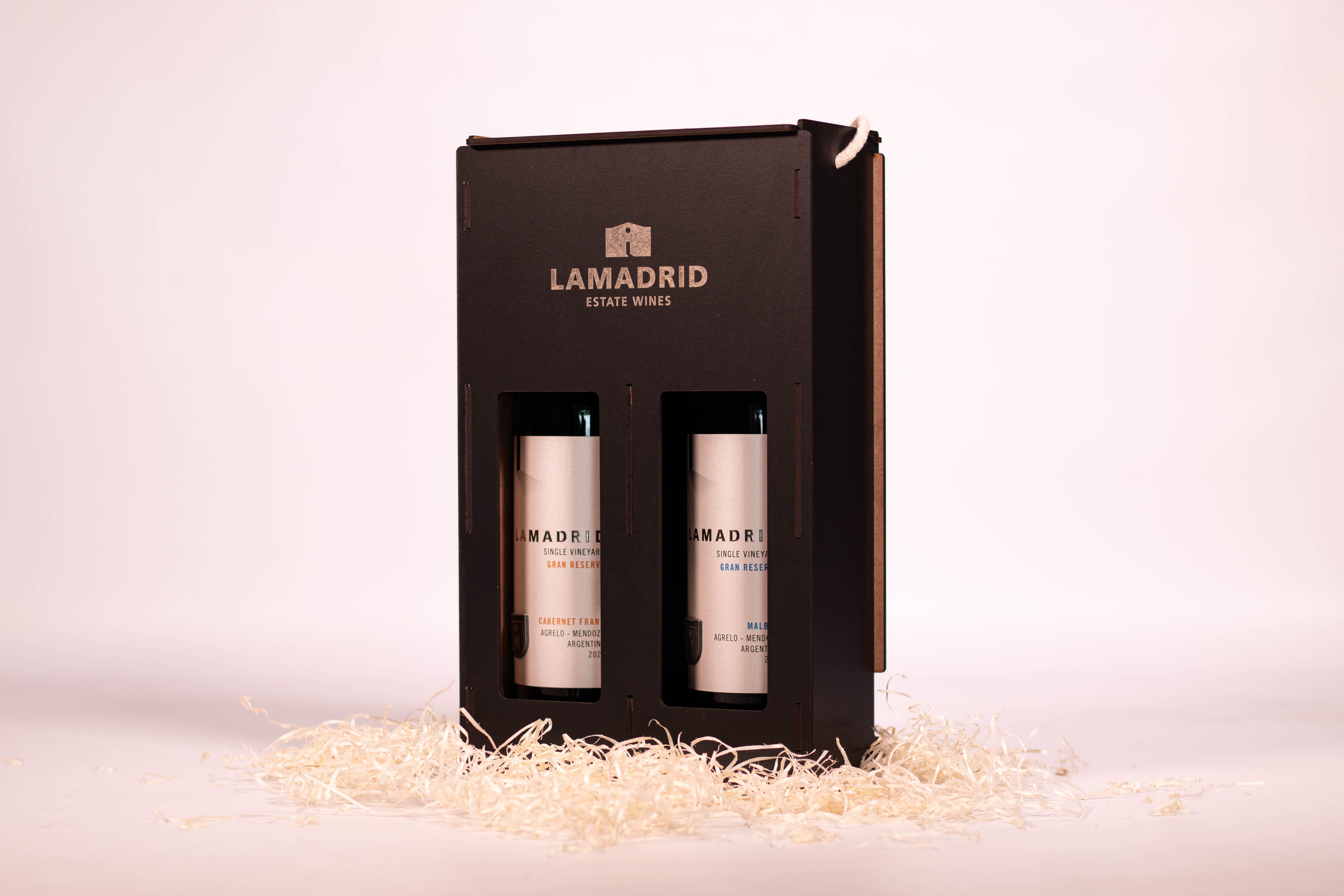 Estuche de Vino Doble - Bodega LAMADRID 1) LAMADRID Single Vineyard Gran Reserva - Cabernet Franc 2) LAMADRID Single Vineyard Gran Reserva - Malbec Este regalo puede personalizarse según preferencias. ¡Consultanos los vinos disponibles!